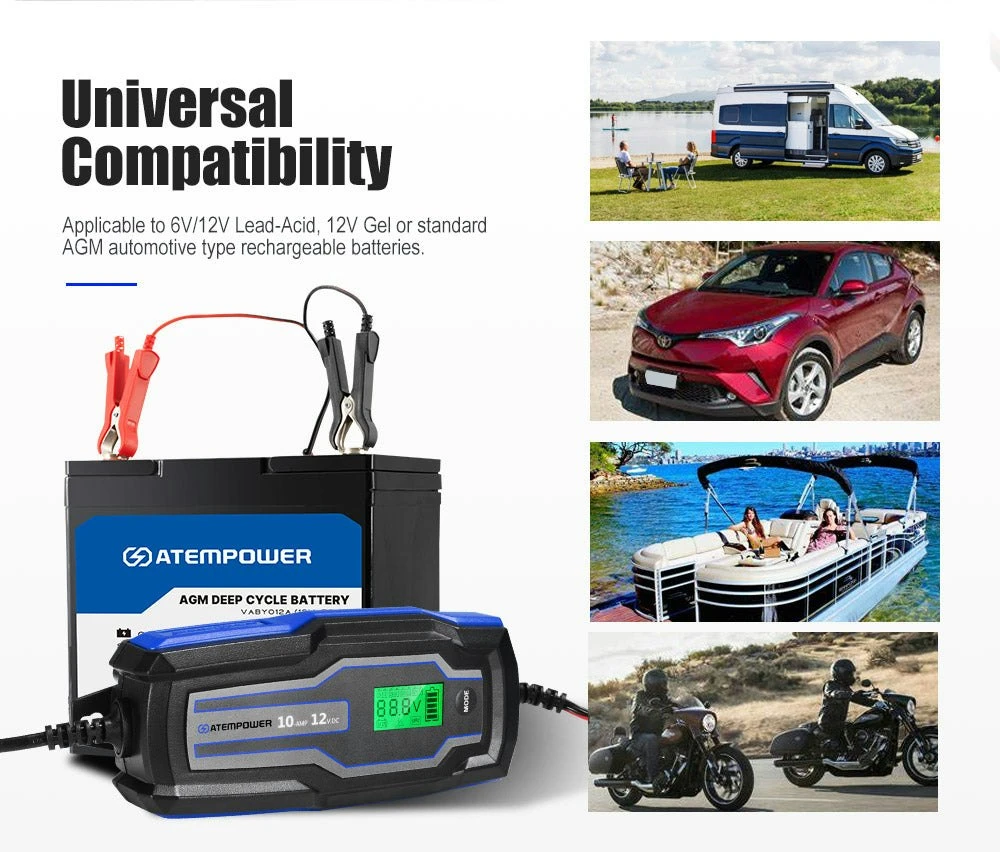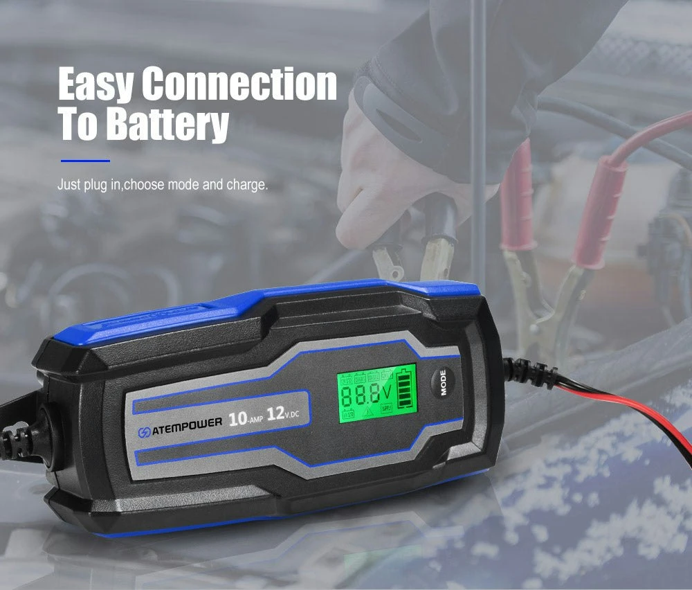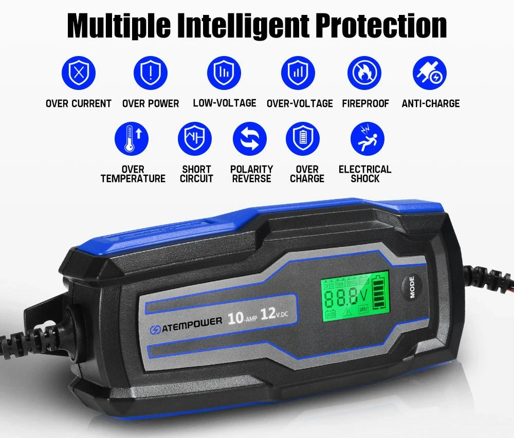 Our intelligent 10-stage charging battery charger for cars and motorcycles aims for better battery performance and longer life expectancy. Operated with the microprocessor controller unit that monitors and controls the charging sequence to achieve full automation, ultra precision, and constant optimization of battery power, it boasts high charging efficiency and multiple charging modes to convert AC power to DC without the need for heavy transformers, this compact and lightweight charger features digital display, plug and play connection, extensive protection, heavy duty construction, which guarantees your safe and convenient use with reliable quality, universal compatibility and versatile functionality. FEATURES High Charging Efficiency: With AC 220-240V, 50/60 Hz input, DC 14.7V/10A peak output, it boasts faster charging rate for 3-200Ah batteries. Automatic 10-Stage Program: Integrated desulfation, repair, analysis and maintenance stages for exceptional battery care and extended battery life. Advanced Charging Tech: Intelligent MCU controlled charging program allows for precision, safety and optimization of battery power. Digital Display: Equipped with LCD screen which displays charging status, voltage, battery type, error information for real time monitoring. Multiple Protection: Short circuit, over temperature, over load, over charge/discharge, over current/voltage, reverse polarity protection. Heavy Duty Construction: Durable flame- retardant ABS housing with water and dust proof rated IP65, corrosion, rust and spark proof. PLUG-N-PLAY Connection: Detachable SAE connectors, O-ring terminals and copper alligator clips for simple battery connection in seconds. Universal Compatibility: This charger by ATEM POWER is applicable to 12V STD/AGM/Calcium/GEL and 6V STD. Versatile Functionality: This smart battery charger features multiple charging modes as well as additional function as 12V power supply. SPECIFICATIONS