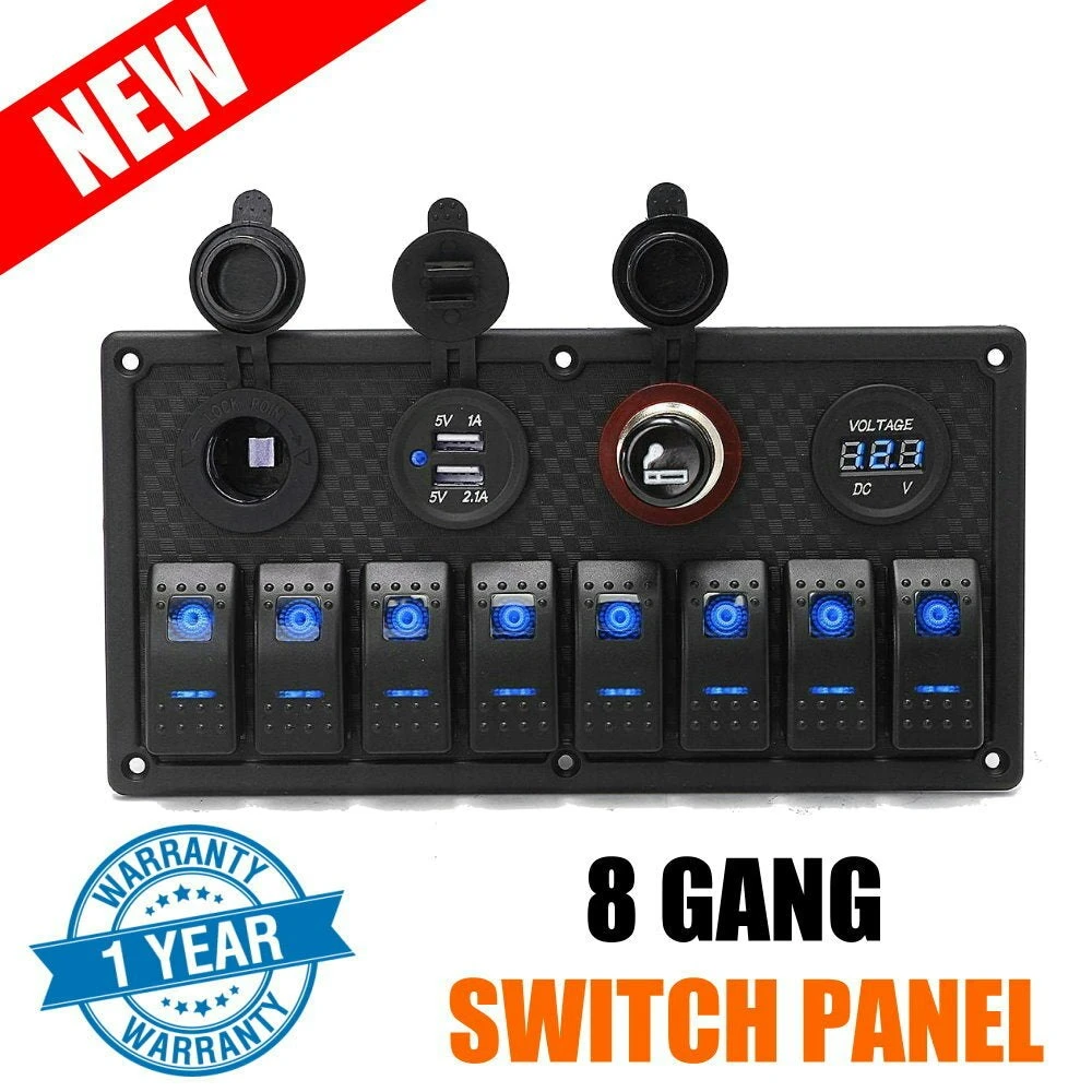 12V 24V 8 Gang LED Rocker Switch Panel USB Car Charger Boat Caravan