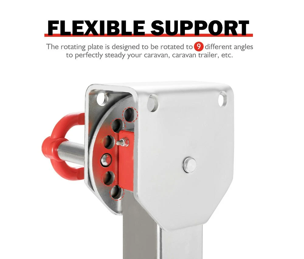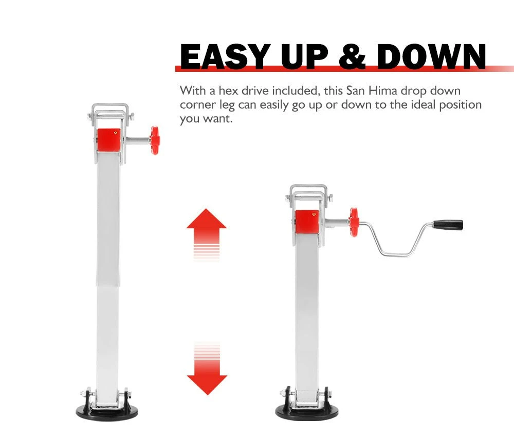 DESCRIPTION Spending holiday with your family is both stress relieving and relaxing, but how about your camper? It will rock on the strong wind especially when you are camping on an uneven ground. And this is where San Hima drop down corner leg comes into play. This drop down corner leg (1,500lbs capacity) is made of heavy-duty steel with electrophoresis, a process that equips this leg with superior rust, corrosion, scratch and impact resistant performance. So you can rest assured that it will accompany you for really a long time. To suit uneven ground, the base will offer your caravan a firmer base and can also achieve a 180° flip. In addition, the rotating plate can also be adjusted to 9 different angles to provide steady yet flexible support to your caravan. A hex drive is included to make the leg go “up” and “down” more convenient. And this device is ideal for trailer, caravan, camper trailer, boat trailer, motorcycle trailer, etc. Be sure not to miss it. FEATURES Durable Construction: Made of heavy-duty steel with electrophoresis process, the SAN HIMA drop down corner leg is rust, corrosion, scratch and impact resistant. Flexible Support: The rotating plate is designed to be rotated to 9 different angles to perfectly steady your caravan, caravan trailer, etc. Bigfoot Base: The heavy duty base designed to offer a firmer base against most terrains, can also achieve a 180° flip. Sturdy Mounting Plate: Made of uncoated iron, this mounting plate can be directly welded to the chassis. Easy Up & Down: With a hex drive included, this San Hima drop down corner leg can easily go up or down to the ideal position you want. Enhanced Capacity: The San Hima drop down corner leg is engineered to withstand up to 1,500 lbs of weight, which is sure to excel your demands. Comfortable Grip: The quick release handle is covered with a comfortable grip to protect your hands. Flexible Installation: The San Hima drop down corner leg can also be welded to the chassis with or without the mounting bracket. Super Versatility: The San Hima drop down corner leg is ideal for trailer, caravan, camper trailer, boat trailer, motorcycle trailer, etc. SPECIFICATIONS