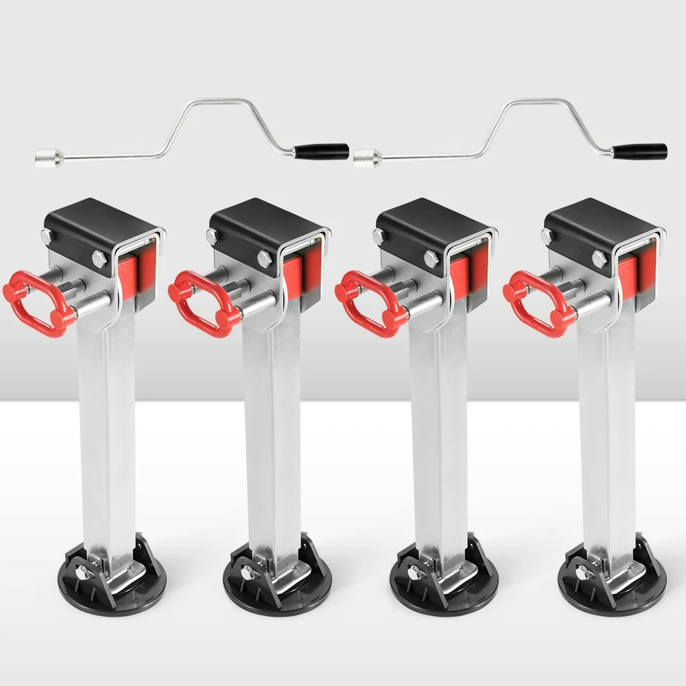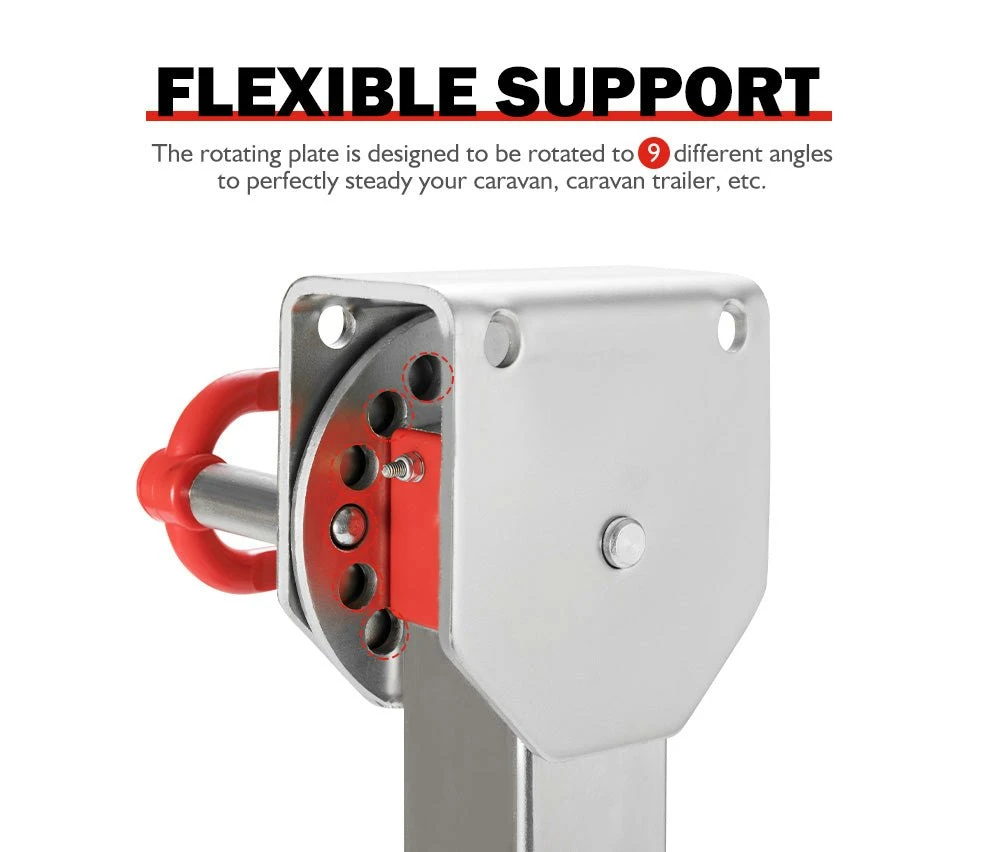 DESCRIPTION Spending holiday with your family is both stress relieving and relaxing, but how about your camper? It will rock on the strong wind especially when you are camping on an uneven ground. And this is where San Hima drop down corner leg comes into play. This drop down corner leg (1,500lbs capacity) is made of heavy-duty steel with electrophoresis, a process that equips this leg with superior rust, corrosion, scratch and impact resistant performance. So you can rest assured that it will accompany you for really a long time. To suit uneven ground, the base will offer your caravan a firmer base and can also achieve a 180° flip. In addition, the rotating plate can also be adjusted to 9 different angles to provide steady yet flexible support to your caravan. A hex drive is included to make the leg go “up” and “down” more convenient. And this device is ideal for trailer, caravan, camper trailer, boat trailer, motorcycle trailer, etc. Be sure not to miss it. FEATURES Durable Construction: Made of heavy-duty steel with electrophoresis process, the SAN HIMA drop down corner leg is rust, corrosion, scratch and impact resistant. Flexible Support: The rotating plate is designed to be rotated to 9 different angles to perfectly steady your caravan, caravan trailer, etc. Bigfoot Base: The heavy duty base designed to offer a firmer base against most terrains, can also achieve a 180° flip. Sturdy Mounting Plate: Made of uncoated iron, this mounting plate can be directly welded to the chassis. Easy Up & Down: With a hex drive included, this San Hima drop down corner leg can easily go up or down to the ideal position you want. Enhanced Capacity: The San Hima drop down corner leg is engineered to withstand up to 1,500 lbs of weight, which is sure to excel your demands. Comfortable Grip: The quick release handle is covered with a comfortable grip to protect your hands. Flexible Installation: The San Hima drop down corner leg can also be welded to the chassis with or without the mounting bracket. Super Versatility: The San Hima drop down corner leg is ideal for trailer, caravan, camper trailer, boat trailer, motorcycle trailer, etc. SPECIFICATIONS