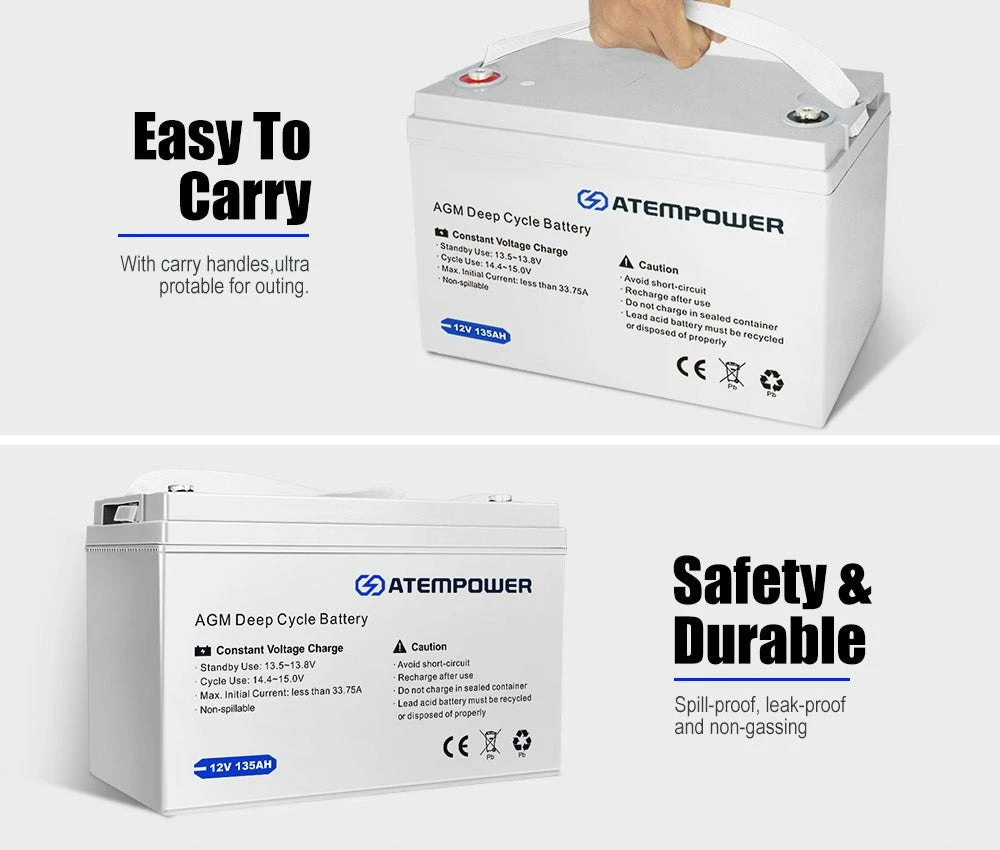 DESCRIPTION The ATEM POWER AGM battery, which has built-in pure lead grip and AGM separator for enhanced conductivity and electrolyte absorption and effective charge keeping, is all weather- and temperature-resistant, and this battery is also designed for a more efficient discharge recovery. Faster recharging technology and battery protection deliver reliable performance. The sealed structure, copper alloy terminals and factory sealed lid allow no leakage of any caustic chemicals, and ABS intrusion-safe body and heavy-duty posts ensure reliable performance against any drastic vibrations shocks or outer wreckage. This maintenance-free battery can be mounted in various positions, and also features longer shelf-life and excellent water retention performance. Its built-in strap offers excellent carrying experience. It emits steady 12V to power most motors, tractors and boats,etc. With ATEM POWER, you are fully equipped to rediscover the fun of off-road. FEATURES Anti-Leakage Construction: Sealed structure, ABS intrusion-safe body and factory sealed lid ensure no leakage of any caustic materials. Weather & Temperature Resistant: All-weatherproof and able to work at temperatures down to -40 degrees Fahrenheit. Reliable Performance: Vibration and shockproof design and the ability to offer cranking to motors and work at temperatures down to -40 degrees Fahrenheit. Optimal Recovery Performance: The incorporation of high oxygen recombination tech ensures there is no loss of electrolyte for more efficient recovery. Faster Recharge: Our batteries recharge up to 5 times faster than flooded batteries, so you can enjoy the convenience of a battery that’s always ready to go. Maintenance Free: Low self-discharge, less prone to sulfation and excellent water retention performance guarantee free maintenance. Longer Lifespan: This Deep Cycle Battery is low self-discharge, less prone to sulfation and excellent water retention which can be kept out of operation for a much longer period while preserving the perfect conductivity. Universal Application: Ready to power most 4wd vehicles, caravans, trailers, saltwater/marine applications, and 12V appliances. User Friendly Design: Built-in straps offer excellent carrying and mounting experience and ensure convenience during daily use. SPECIFICATIONS