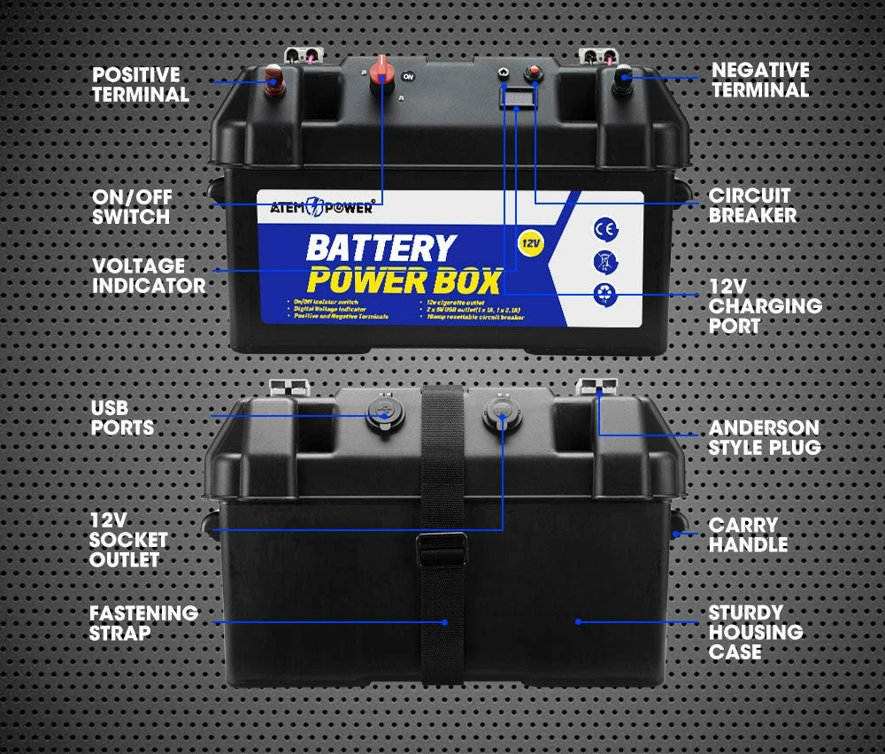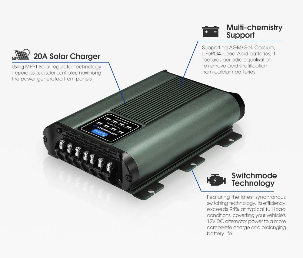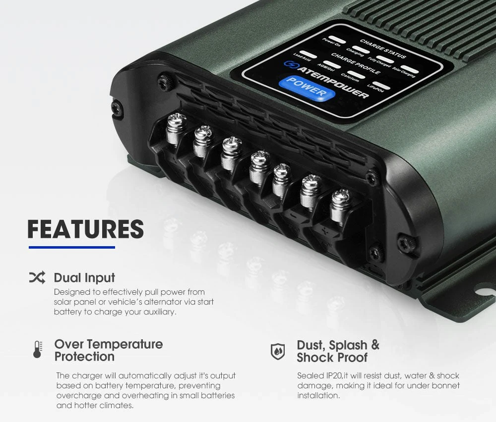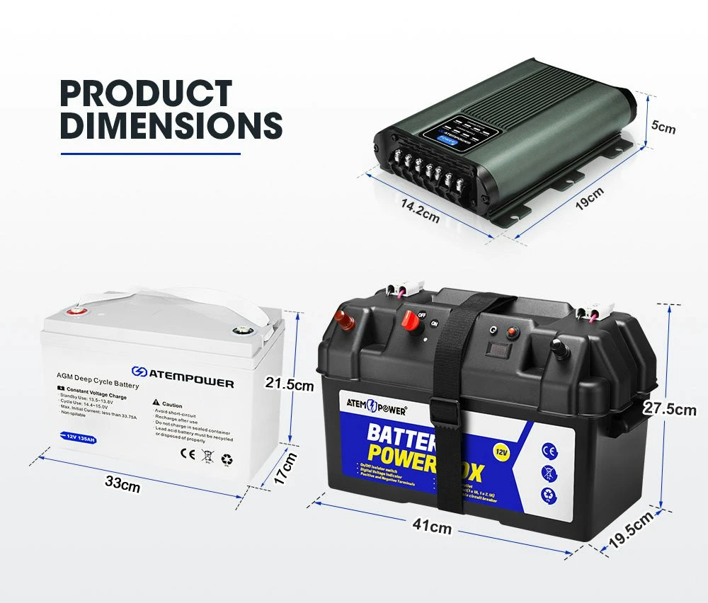 This 12V 20A DC-DC charger by ATEM POWER, which is designed to do a full charge cycle with the ability to choose either Lead Acid, AGM, Gel, calcium, LiFePO4 batteries and apply the suitable charging profile to prolong their lifespan, also incorporates Re-selection Ready mechanism that allows you to re-select the battery during charging by long pressing “POWER”. FEATURES Battery-Anti-Leakage Construction: Sealed structure, ABS intrusion-safe body and factory sealed lid ensure no leakage of any caustic materials. Battery-Weather & Temperature Resistant: All-weatherproof and able to work at temperatures down to -40 degrees Fahrenheit. Battery-Longer Lifespan: This Deep Cycle Battery is low self-discharge, less prone to sulfation and excellent water retention which can be kept out of operation for a much longer period while preserving the perfect conductivity. Battery-User Friendly Design: Built-in straps offer excellent carrying and mounting experience and ensure convenience during daily use. Charger-Dual Input: This Charger is designed to effectively pull power from solar panel (up to 20A) or vehicle’s alternator to charge your auxiliary battery,built-in MPPT regulator is designed to harvest up more energy from the solar panel. Charger-Multi-Stage Charging: This charger integrates standby, pre-charge, constant current charging, constant voltage charging, full charge and re-charge. Charger-Multiple Protection: It integrates over-charge, short circuit, over-temperature, thermal load, solar input overload, input/output reverse polarity protection. Charger-Upgraded Charging Algorithm: This algorithm is designed to select the optimum charge mode and revive your discharged battery. Charger-User Friendly Design: The LED indicator shows real-time stage of charging and memory function is integrated to make your charging more convenient. Charger-Please note: always refer to the wiring diagram in this listing for the latest wiring setup of the product as the user manual might be for previous version. SPECIFICATIONS