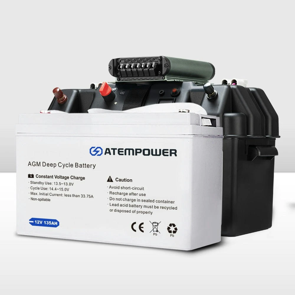 DESCRIPTION The ATEM POWER AGM battery, which has built-in pure lead grip and AGM separator for enhanced conductivity and electrolyte absorption and effective charge keeping, is all weather- and temperature-resistant, and this battery is also designed for a more efficient discharge recovery. Faster recharging technology and battery protection deliver reliable performance. The sealed structure, copper alloy terminals and factory sealed lid allow no leakage of any caustic chemicals, and ABS intrusion-safe body and heavy-duty posts ensure reliable performance against any drastic vibrations shocks or outer wreckage.