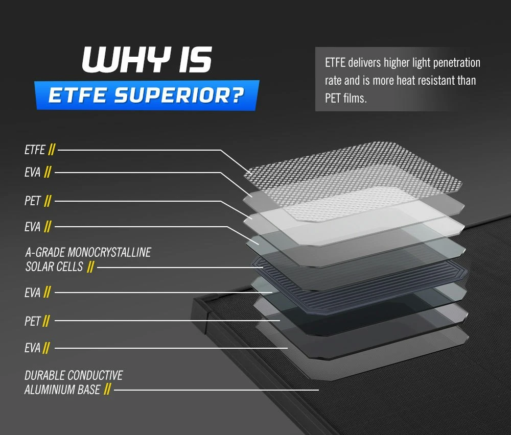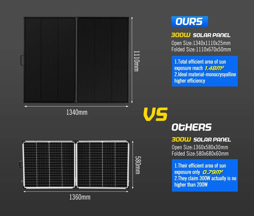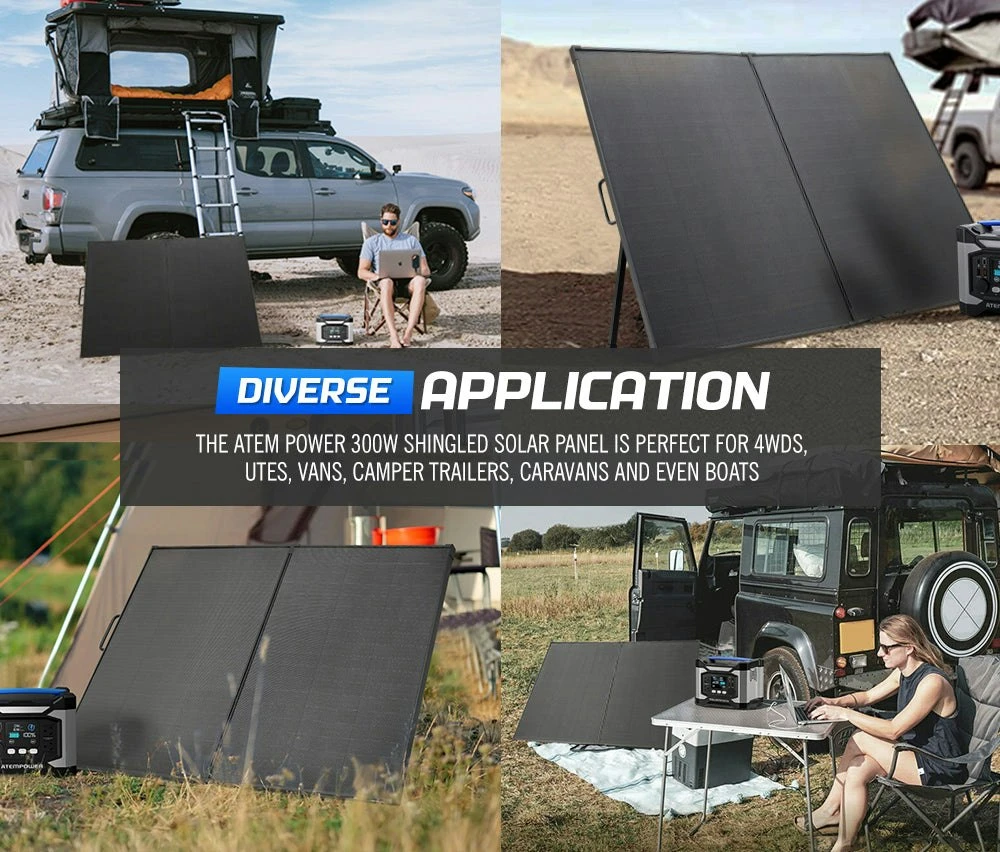 This 300W shingled folding solar panel avoids the use of ribbons, busbars, and soldering processes, the cells are cut into 5 or 6 strips then joined together using electrically conductive adhesives (ECA). So there is nothing but pure cell, and you’ll get 15~20% output than traditional folding solar panels, while significantly reducing the losses and hot spot effect caused by shade. This IP-65 rated 300W shingled folding solar panel/shingled solar panel allows you to stay in charge wherever you go. From camping to outdoor activities, unfold this shingled folding solar panel and start capturing solar power in seconds. FEATURES Shingled Cell Tech: This tech avoids the use of ribbons, busbars but creates a string of strips, so more cells are exposed to sunlight for increased energy harvest. Improved Reliability: Almost 30 metres of busbar and soldered joints are done away with. This reduces the risk of busbar failures of the shingled panel. Less Energy Loss: The shingled cells are wired in parallel that significantly reduces the losses and hotspot effect caused by shade compared with traditional panel. Greater Output: Jointed together by using electrically conductive adhesive (ECA) instead of busbars, you’ll get improved 15~20% output than traditional panel. Waterproof & Rigidity: Built with a tough aluminium frame, this shingled panel has an IP-65 waterproof rating, so no worries about the rainy days. Subversive ETFE Tech: This tech delivers higher light penetration rate and is more heat resistant than PET films. Suitable for Most Batteries: This 300W shingled solar panel is compatible with lead acid, AGM, GEL, Flooded, lithium-ion and LiFePO4 batteries Diverse Application: The ATEM POWER 300W shingled folding solar panel is perfect for 4WDs, utes, vans, camper trailers, caravans and even boats! More Aesthetic: This shingled folding solar panel has no visible circuitry which gives it clean, simple and sleek look while providing superior appeal. Optimally Designed: Kickstands maximizes power harvesting, magnetic design makes it easy to unfold and fold, and a carry bag invite more portability. SPECIFICATIONS