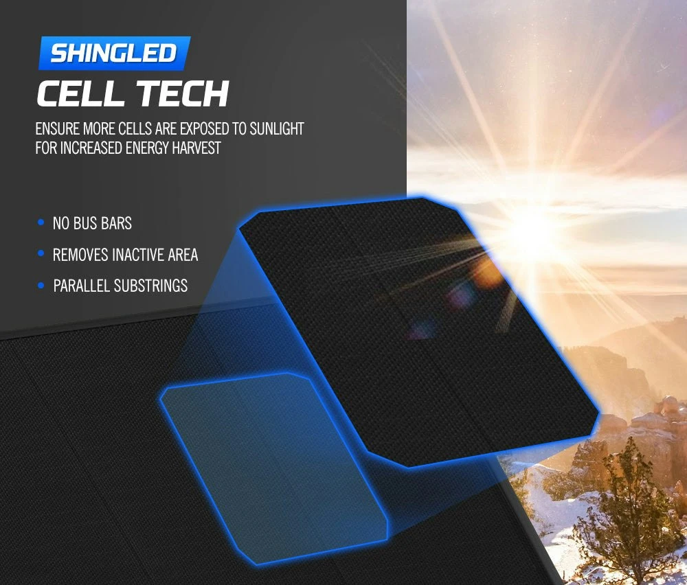 DESCRIPTION Solar panels provide a way to capture the sun’s energy and put it to power your batteries. But ATEM POWER has taken a step further by integrating the newest shingled solar cell technology into its shingled folding solar panel/shingled panel with the key advantages: more power, improved reliability and more aesthetic.