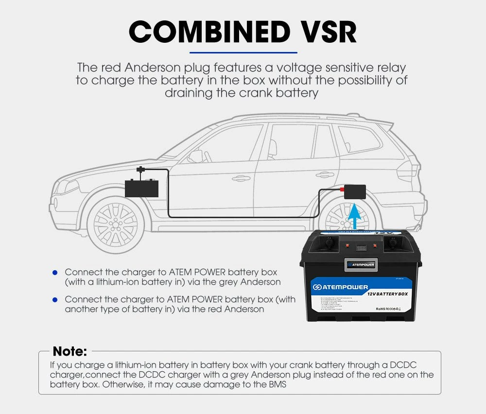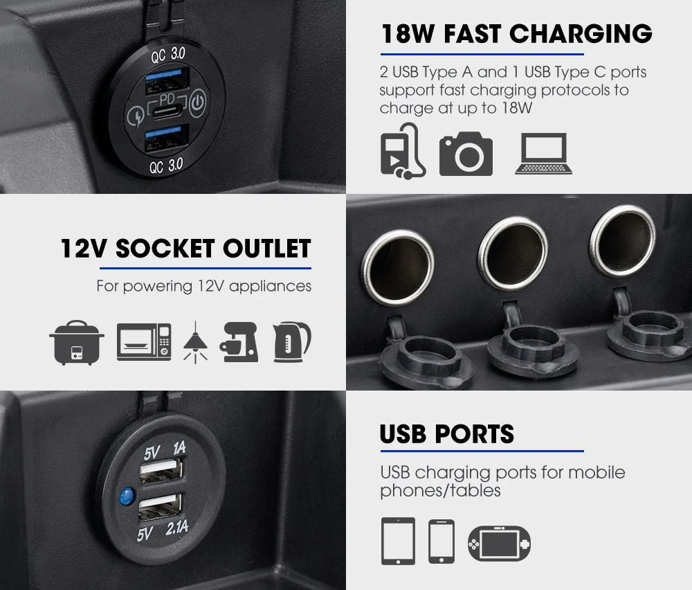 This marine battery box comes with 3 cigarette lighter sockets, 5 USB ports, 3 of which support fast charging protocols, and 2 Anderson plug outputs that give you easy access to charge multiple electronic devices. Unlike most other models on the market, all Anderson plugs are recessed into the body to reduce likelihood of damage. And the red Anderson plug features a VSR which allows the battery in the RV battery box to charge from the crank battery and automatically cuts the link between the two batteries when the voltage drops below 12.5V. With this 12V battery box, you can power camp lights, fridges, charge phones, tablets and plenty more wherever you go. FEATURES Create a Power Station: The ATEM POWER battery box turns an ordinary battery into a convenient and user-friendly power station. Easy to Wire up: The marine battery box comes pre-wired, so all you need to do is to connect to the battery terminals and it is good to go. Multiple Outlets: 3 cigarette lighter sockets, 5 USB ports, and 2 Anderson plug outputs allow you to connect a range of devices. 18W Fast Charging: 2 USB Type A and 1 USB Type C ports support fast charging protocols to charge at up to 18W. Combined VSR: The red Anderson plug features a voltage sensitive relay to charge the battery in the box without the possibility of draining the crank battery. Integrated Fuse: The battery box is engineered with a 70A fuse which protects sensitive appliances. Protect Your Battery: Constructed of durable HDPE and perfect for mounting into a vehicle, canopy or trailer, the battery box will protect your battery. Recessed Ports: All ports of this RV battery box are recessed into the body to reduce likelihood of damage. Digital Voltage Display: This RV battery box comes with a volt meter which provides you with the exact voltage of the battery. Convenient Buckle: With the large-sized buckle, the lid of the battery box can be closed tightly and there is no need for straps to secure the lid. SPECIFICATIONS