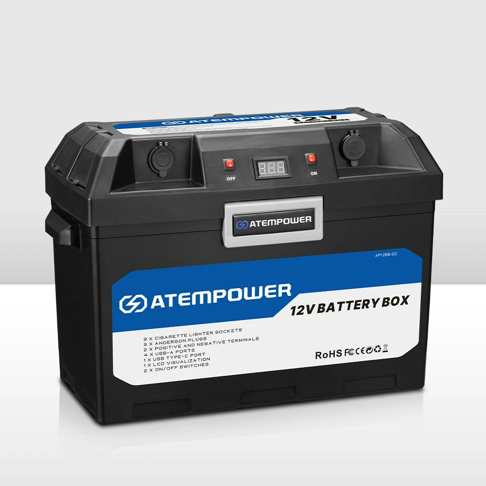 DESCRIPTION A battery box will instantly turn your battery into a portable power hub. This ATEM POWER RV battery box gives you reliable 12V power options to make your battery functional. All the sockets on the battery box are pre-wired – just connect your battery to the positive and negative terminals and you’re ready to go.