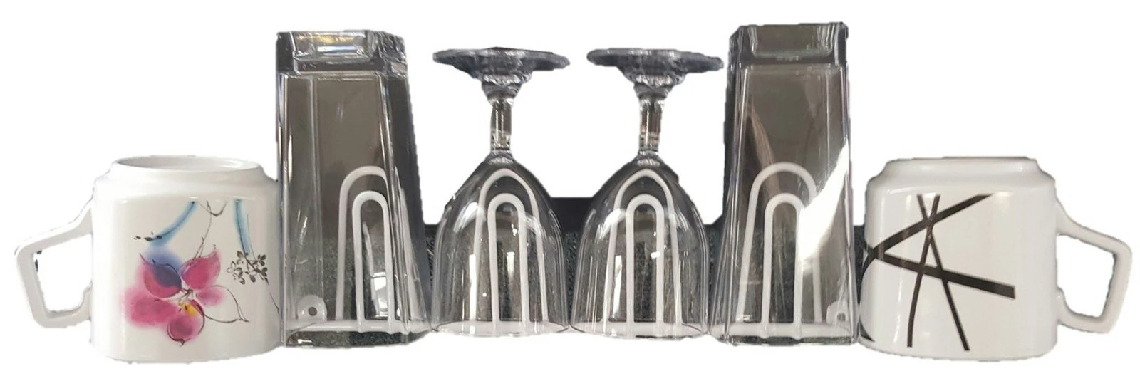 Plastic coated glass and tumbler wire racks. Mounts onto wall or cupboard.