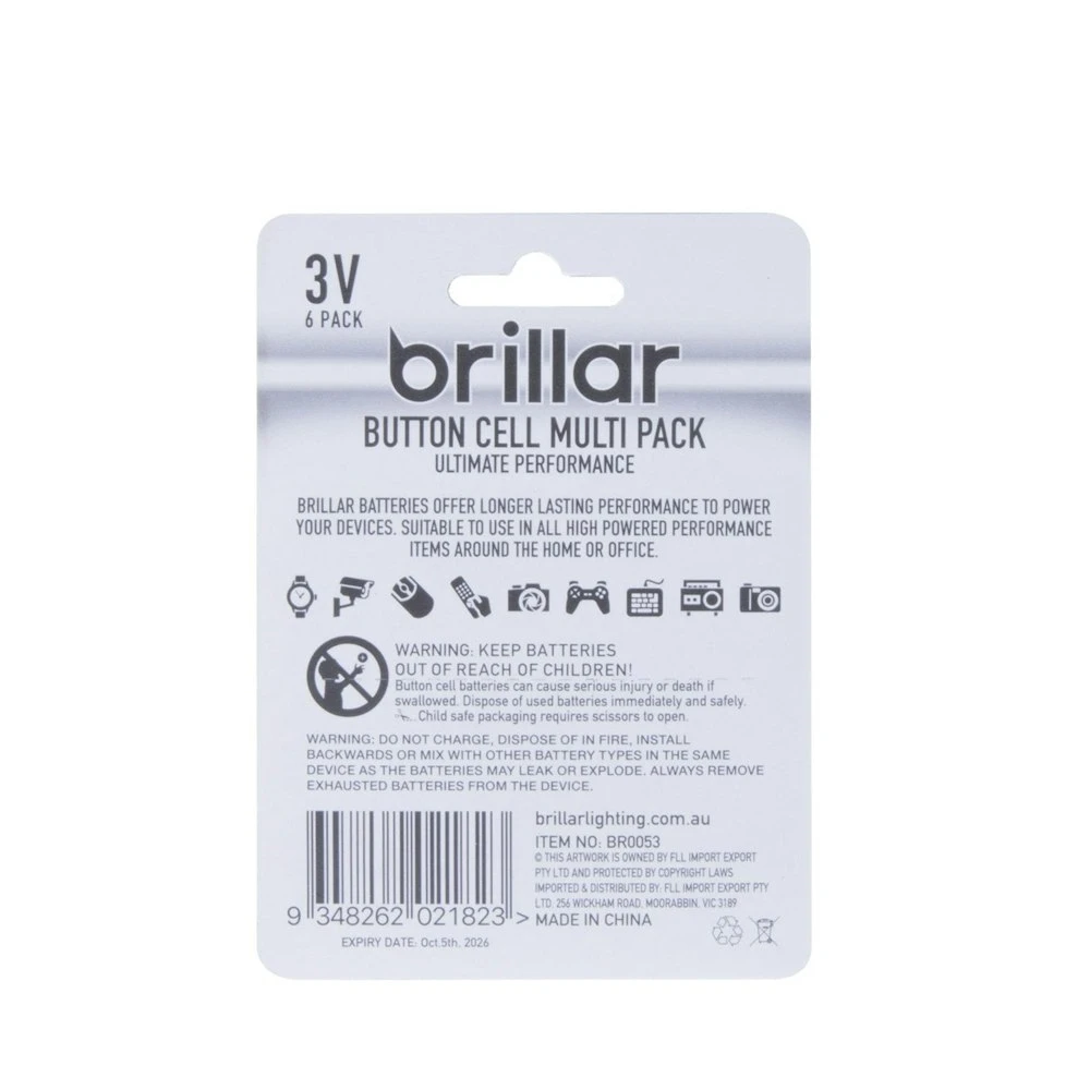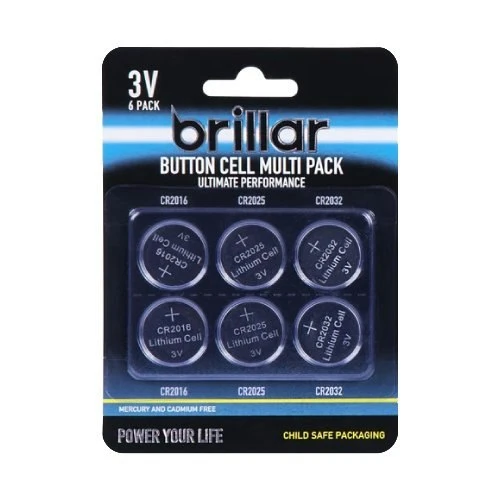 Brillar lithium button cell batteries offer longer-lasting performance to power your devices. Suitable to use in all high-powered performance items around the home or office. 3 volt – 2 x CR2016, 2 x CR2025, 2 x CR2032 Mercury and Cadmium free Child safe packaging 1 x 6 pack