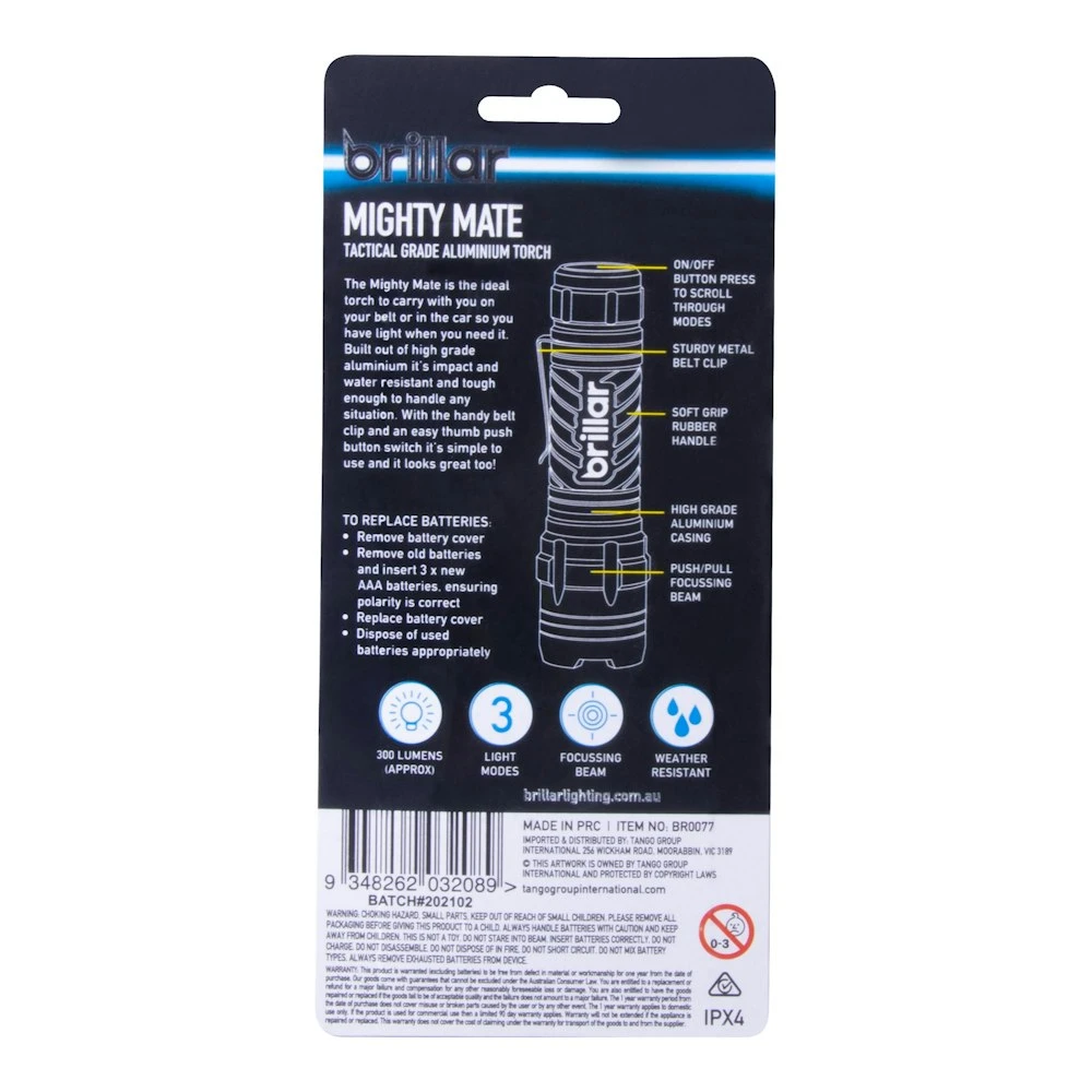 300 lumens 3 light modes Push/pull focussing beam Ipx4 weather and impact resistant Tactical grade aluminium casing with soft rubber grip Sturdy metal belt clip Requires 3 x aaa batteries (included)