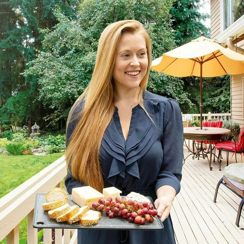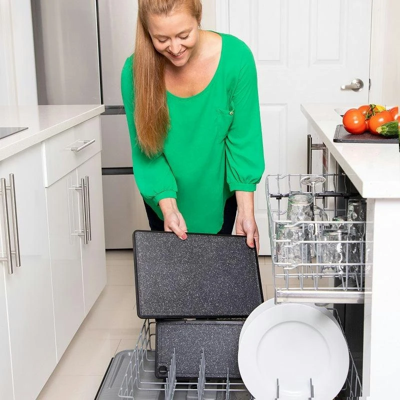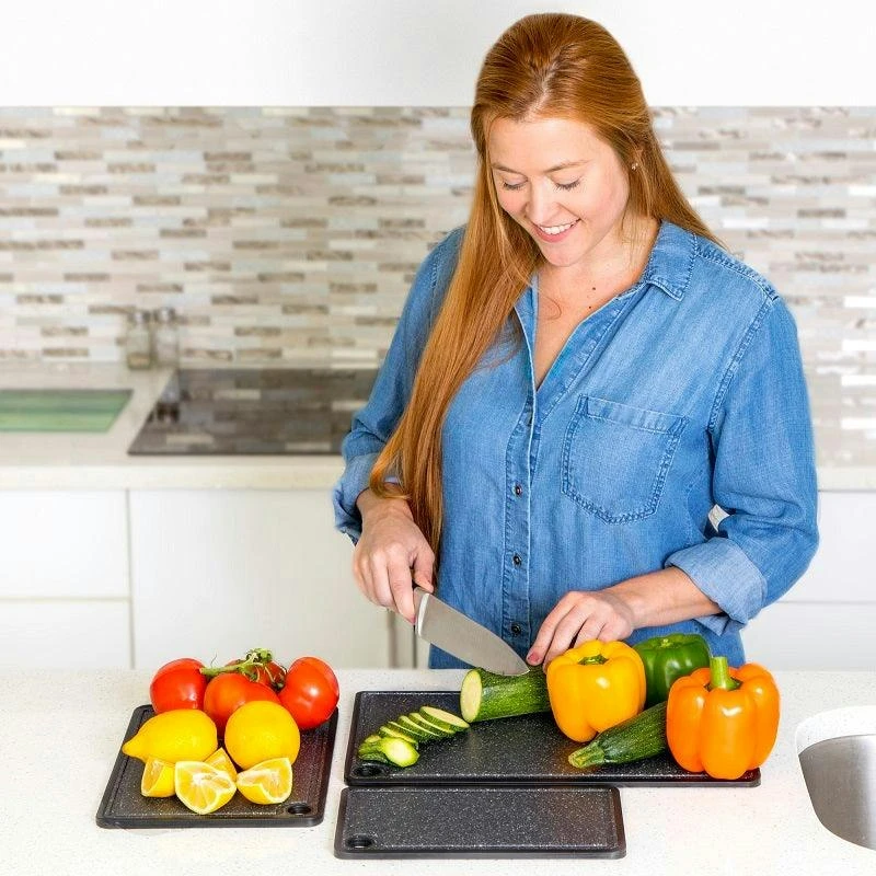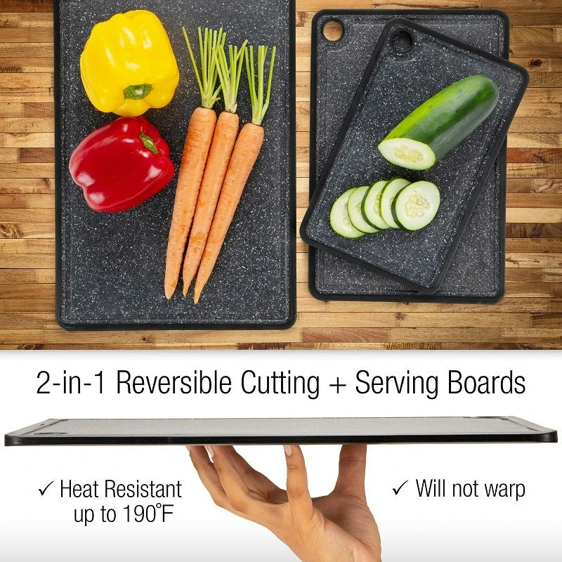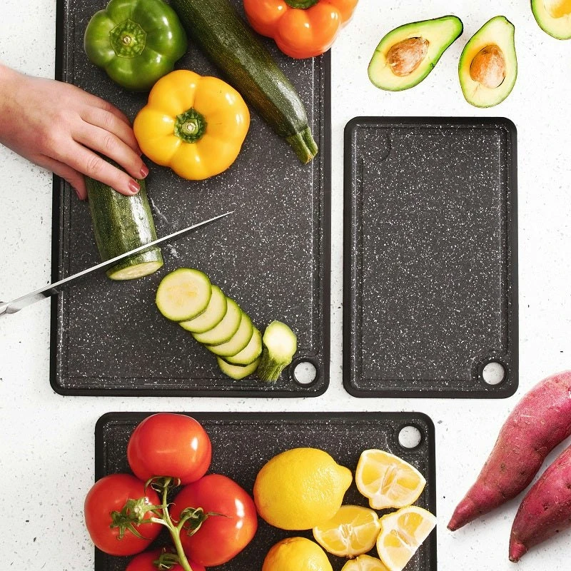 CAOS Marble Look Cutting Board 3 Pack – Large, Medium & Small These cutting boards are non-slip and reversible – BPA-free plastic and dishwasher safe for use in the kitchen, food and meal preparation. This multifunctional food cutting, chopping, and serving board set is easy to clean and store. Each board comes equipped with a hanging point for air-drying and space-saving storage. Durable chopping board set is created to maintain and ensure the quality and sharpness of your knives. Each cheese and wine board is knife safe and will not blunt or dull your cutlery, even over extended use. Finished in granite appearance, this attractive serve ware makes for an elegant food presentation board Features: