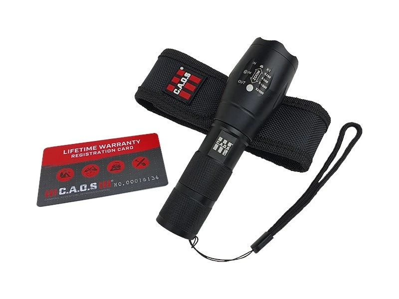 CAOS TACTICAL LED Flashlight 5 modes with 10W XML-T6 super bright torch including nylon belt pouch. Great for camping, hiking, fishing, running, dog walking, power outages and emergencies. Super bright tactical flashlight with lanyard, holster; zoomable beam with 5 selectable modes. Tested Tough by Aussies for Aussies®, this torch has been tested to confirm its durability. It has been dropped onto concrete, driven over by a 4×4… several times, hosed and it still performed like the day it came out of the box. Features: