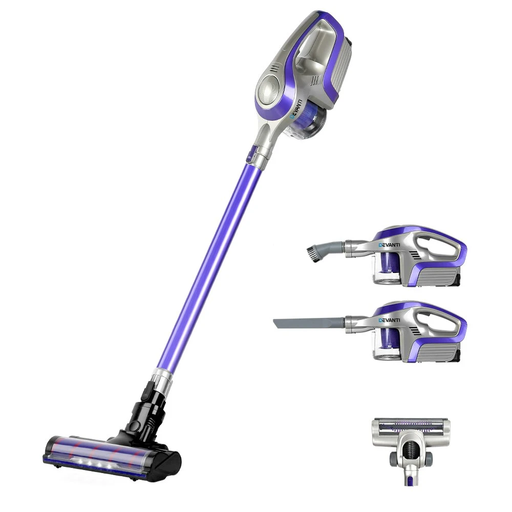 The Devanti 150W Handstick Vacuum Cleaner now comes with a motorized roller head that has an in-built motor to power up cleaning with the help of crevices and a soft roller for tender cleaning on pristine surfaces. Better still, it incorporates a tangle-free design that prevents hair from being tangled with the roller, thereby keeping maintenance down-time to a minimum. Other great features include a pivoting head with tilt and angle adjustment, anti-static carbon fibre filaments, removable cover and brushes and not least, a LED headlight to assist cleaning in dimly lit or under furniture areas. All collected dirt and debris pass through a washable and reusable HEPA filter that eliminates up to 99.97% of dust and allergens. Not least, the rechargeable 2000mAH lithium-ion battery can run continuously up to 25 minutes on a full charge. Features *Cordless and lightweight *Long reach *2000mAH Li-ion battery *(Replacement battery available in-store) *Motorised roller cleaner head *LED headlight *Pivoting head *Tilt and angle adjustment *Flexible stick movement *Multi-function brush nozzle *Crevice nozzle *One-handed design to empty dust container *Bagless with HEPA filter *(Replacement HEPA filters available in-store) *Washable and reusable HEPA filter *Eliminates up to 99.97% of dust and allergens *25 minutes continuous running time *Quick battery charging Specification *Brand: Devanti *Power: 150W *Suction power: 8000Pa *Motor rotate speed: 30000rpm *Lithium battery capacity: 2000mAH *Running time: 25 minutes *Charging time: 5 hours *Dustbin capacity: 0.5L *Tube length: 62cm *Adaptor cable length: 180cm *Overall dimensions: 23cm x 19cm x 124cm *Colour: Purple and grey Package Content Devanti Vacuum Cleaner x 1 Motorised Roller Cleaner Head x 1 Aluminium Tube x 1 Brush Nozzle x 1 Crevice Nozzle x 1 Nozzle Adaptor x 1 Rechargeable Battery x 1 Battery Charger x 1 Charger Adaptor x 1 User Manual x 1 Bonus Standard Cleaner Head x 1