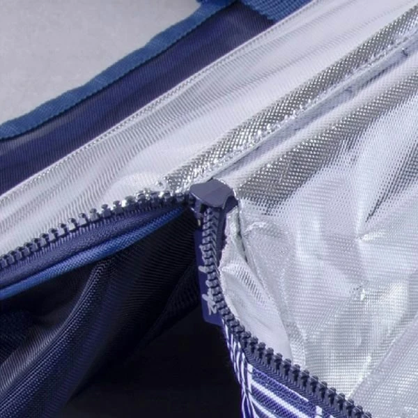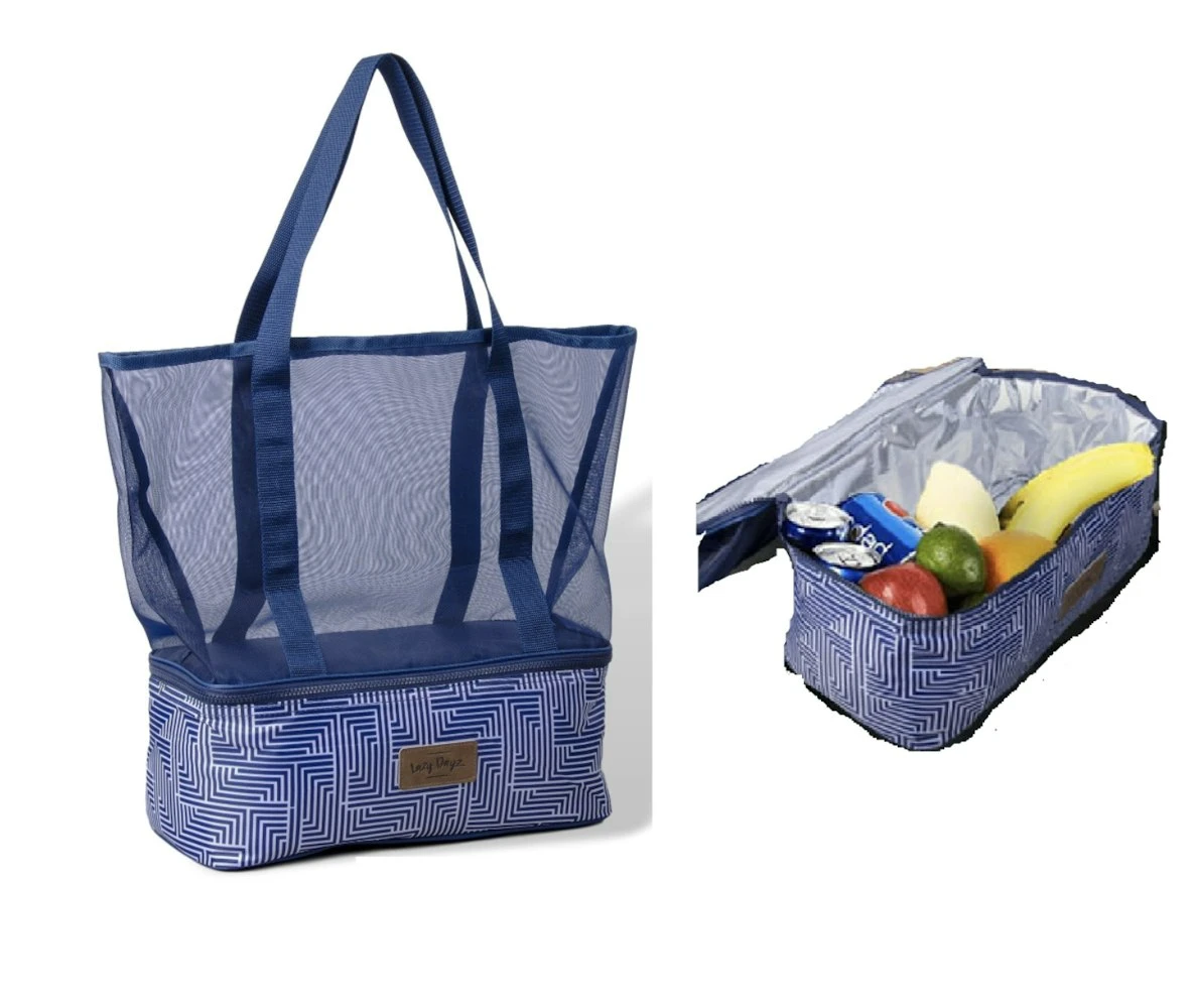 Enjoy the convenience of this fashionable, lightweight, canvas and mesh zippered beach bag with an additional cooler bag compartment.