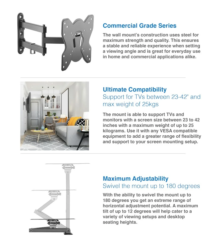 – **Ultimate Compatibility** – The mount is able to support TVs and monitors with a screen size between 23 to 42 inches with a maximum weight of up to 25 kilograms. Use it with any VESA compatible equipment to add a greater range of flexibility and support to your screen mounting setup.