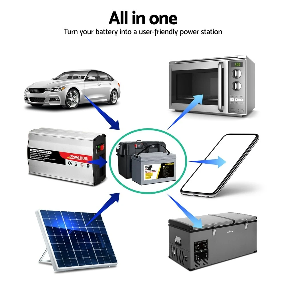 From a powerful battery to a formidable power station. That is what our GIANTZ Deep Cycle Battery and Battery Box combo can do. On its own, the 135Ah 12V battery features an incredible cycle life of up to 1400 cycles. What you get is a longer, consistent and more drawn out charge all the time. And with its advanced AGM technology, the battery enables better electrolyte absorption, cyclic stability and frequent charging without affecting performance. The bolt-down terminals also allow for a more reliable experience, and not least, the high oxygen-recombination efficiency results in superior deep discharge recovery. And not to be outdone, the battery box easily fits the battery and together, they can power up a host of 12V devices including camping lights and portable fridges with its cigarette lighter socket as well as mobile phones and tablets with the two USB ports. The box itself can be charged using solar panels or any power source with its quick-connect Anderson plugs. Better still, the box comes pre-wired, so all you need to do is connect to the deep cycle battery terminals and it is good to go. More power to you. That is definitely true with the GIANTZ deep cycle battery and battery box. Note: 1.Please charge the battery on receiving it even if the battery will not be used in the near future. 2. Maintenance-free means the terminals need not be refilled. However, the battery must be recharged periodically after use. 3. It is advised to charge the battery every 3 months if not in use for long periods. This is to prevent over-discharging of the battery which will cause irreparable damage to it. 4. AGM deep cycle batteries have a much longer cycle life if they are exhausted to a small degree and then recharged, rather than draining all their power and recharging all the away. Features: 135Ah battery: Greater cycle life Max. cycle life of 1400 cycles Industry-leading build life Higher sulfation resistance Longer storage life Maintenance-free Superior deep discharge recovery Better low temperature performance High oxygen-recombination efficiency Advanced AGM technology Spill-proof, leak-proof and non-gassing Bolt-down terminals Convenient carry handle Battery box: Protective and portable User-friendly Digital voltage indicator 10A resettable circuit breaker Two USB ports Cigarette lighter socket Anderson plugs Positive and negative terminals Sturdy housing Heavy-duty carry handles Tie down strap Specifications: 135Ah battery: Overall dimensions: 33cm x 17.1cm x 21.6cm Approx. weight: 29.5kg Container material: ABS Terminals: Bolt-down Nominal voltage: 12V Rated capacity (10-hour rate): 135Ah Maximum cycle lIfe: 1400 cycles (@30% DOD) Minimum build life: 7 years Internal resistance: Approx. 5.0m? Maximum discharge current: 1200A (5s) Maximum charge current: 25A Operating temperature ranges: Discharge: -15C to 50C Charge: -20C to 50C Storage: -20C to 50C Capacity affected by temperature: 40C = 102% 25C = 100% 0C = 85% -15C = 65% Float charge: 13.5 to 13.8V Equalise charge: 13.8 to 14.1V Cycle charge: 14.4 to 15.0V Self-discharge 3% of capacity declined per month at 25? Battery box: Overall dimensions: 43.5cm x 25.5cm x 30cm Inner dimensions: 36cm x 20.5cm x 24cm Product Contents: Item Description:Quantity: Deep cycle batteryx1 Battery boxx1 User instructionsx1