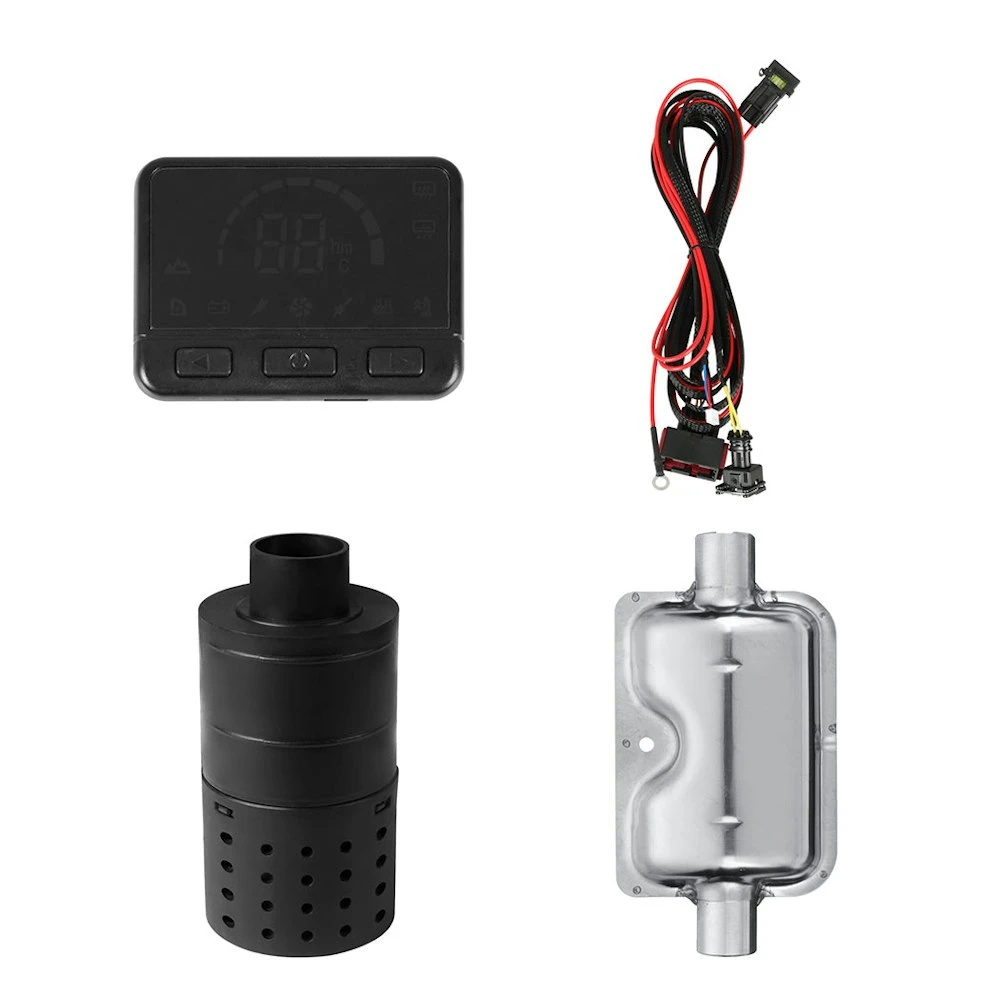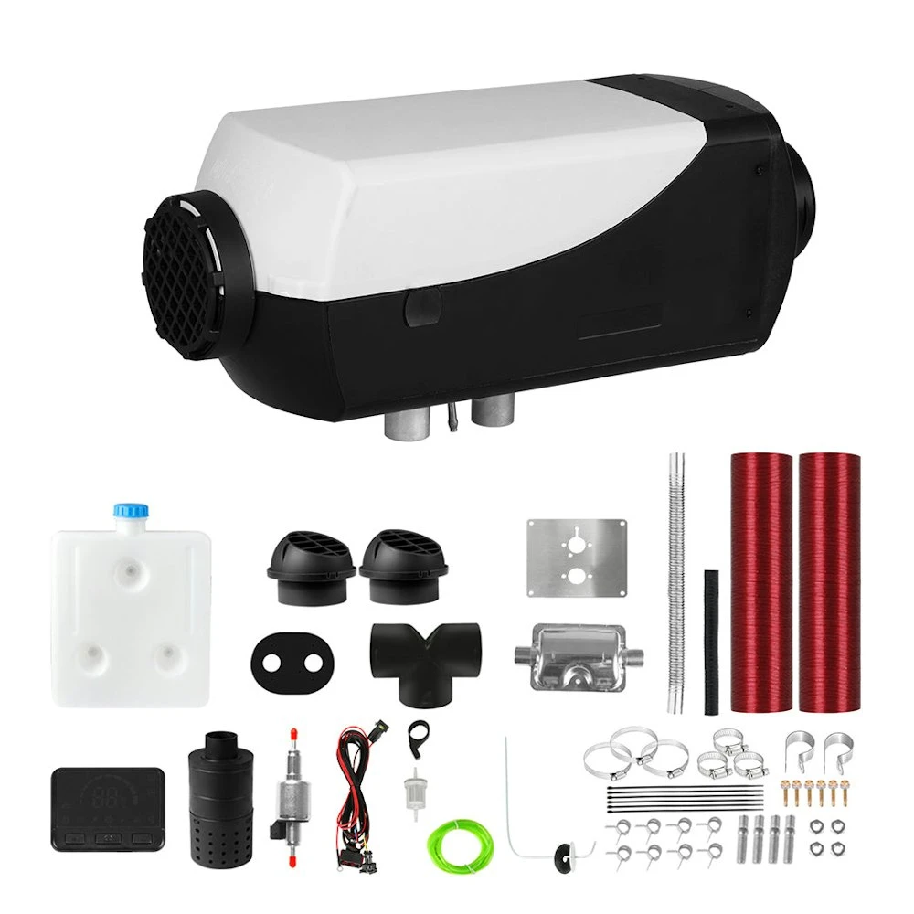 Stay toasty with your new diesel heater. Keep your truck caravan car tent or boat warm. All you need is a 12v power supply and some diesel. Just make sure you exhaust it properly. Stop running your big motor to keep your cabin warm. Just turn your 12v diesel heater on. Save fuel as your diesel heater only keeps you warm rather than running your big engine. Turn your 5kW diesel heater with confidence. All exhaust is vented outside. If your heater overheats it will just shut down. Stop worrying about accidental fires. Control all your heater needs from the smart LCD panel on your diesel air heater. Pick the heater setting and just make sure you got enough diesel to run it all night long. Make sure you have a 12V power supply for your diesel parking heater. A standard car battery carries the right charge. You can install this heater yourself. Just follow the instructions. Key Features 12v/5kw portable diesel air heater Low emissions and low fuel consumption Rapid heating and low noise Extend your engine’s life by just running your diesel heater LCD monitor to control your heater Overheating protection Easy to install Safe to use and long service life Note: Combustion air inlet and exhaust outlet must be outside of vehicle to avoid carbon monoxide poisoning. SPECIFICATION: Material: Plastic steel Rated Voltage: 12v Heater Power: 8kw Fuel type: Diesel only Air Conditioning Type: Heating Fuel Consumption(L/h): 0.16 – 0.64 Switch type: LCD switch Fuel Tank: 10L LCD Display: Digital Thermostat with Temperature Control(2021 Newest) Working Temperature of the Heater: -40°C to 50°C Working Temperature of the Oil pump: -40°C to 40°C Dimension: Heater – 39cm x 14cm x 14cm Tank – 41cm x 32cm x 8cm (L x W x H) Colour: Black and white Note: Professional installation is highly recommended PACKAGE CONTENT: 1x 12V 8KW Diesel Heater 1x 10L Plastic Tank 1x Mounting Plate 1x T-piece 1x Air Intake pipe 1x Exhaust pipe 1x Fuel Pump 1x Fuel Extractor 1x Fuel Pump Shock Clip 1x Shock Pad 1x Fuel Line 1x Diesel Filter 1x Wiring Harness 1x Digital Thermostat 2x Duct 2x Vent 1x Air Filter 1x Exhaust silencer 1setx Installation Kit 1x Instruction Manual