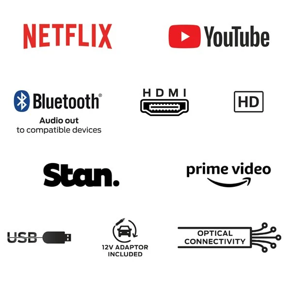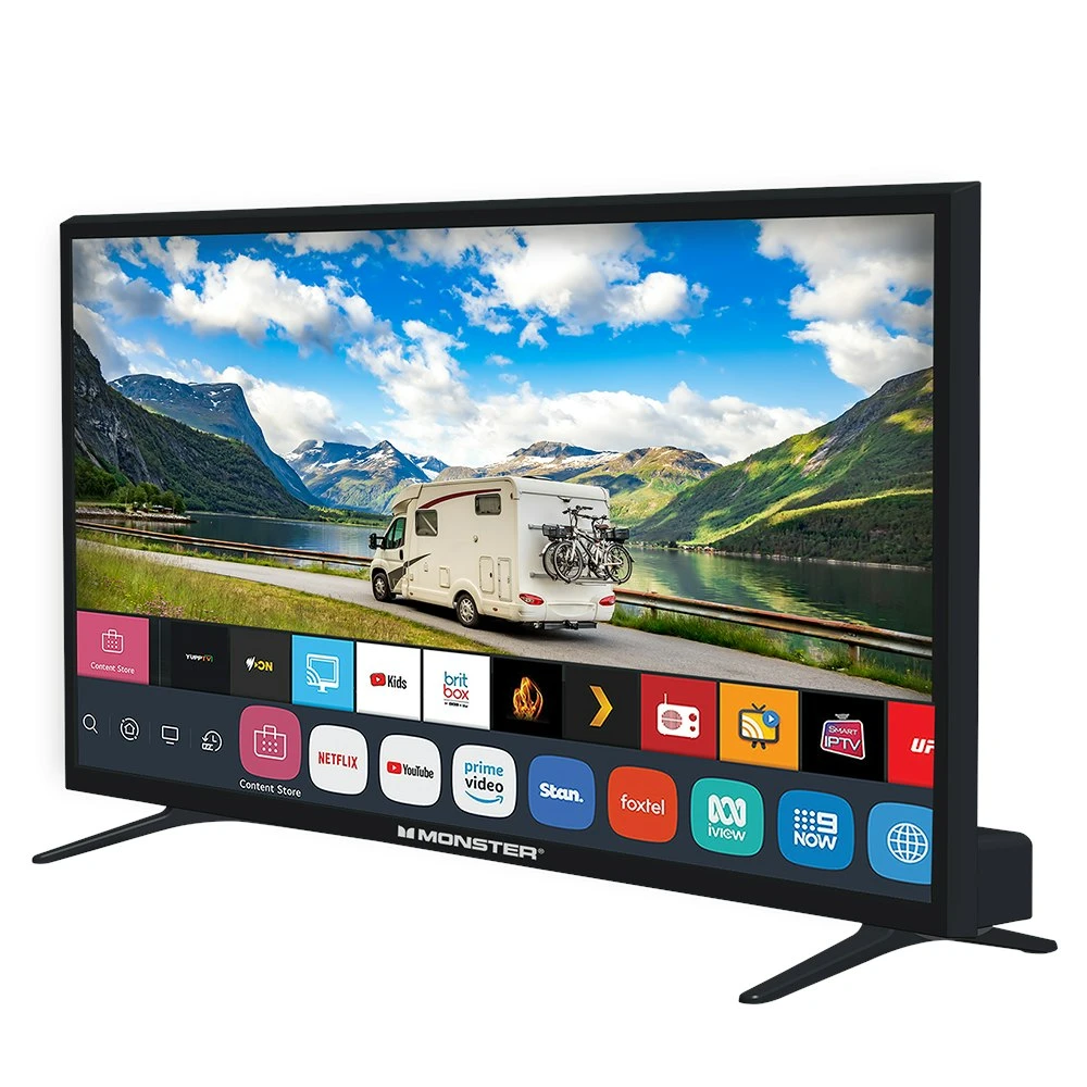 The Monster Smart MRV 12v / 240V TV’s have been designed specifically for both RV’s & Caravans with the Nomad traveller in mind. With WEB OS & Bluetooth connectivity built in you get to experience all the smart features your way, including Photos, holiday Video Edits, Movies, device sharing or even as an external Monitor whilst on the road. Either connect to your existing Caravan WIFI, HOT SPOT to you phone or invest in a 4g 12v Caravan Router allows you to enjoy all your favourite content whist having the holiday of a lifetime. Specifications: Display size: 24” (60cm) Resolution: 1366 x 768 Aspect Ratio: 16:9 Bluetooth: Yes Video System: MPEG-2, MPEG-4, H.264, H.265, AVS OSD Languages: Multi-languages Sound System: MPEG-1 layer 1/2, MPEG-2 layer 2 Max Audio Output: 2x8W Power Supply: 100V-240V 50/60Hz Power Consumption: 40W Standby Power: 0.5W Warranty: 3 Years Inputs: Antenna x1 USB x2 CVBS IN x1 AV L IN x1 AV R IN x1 HEADPHONE x1 HDMI x3 OPTICAL x1