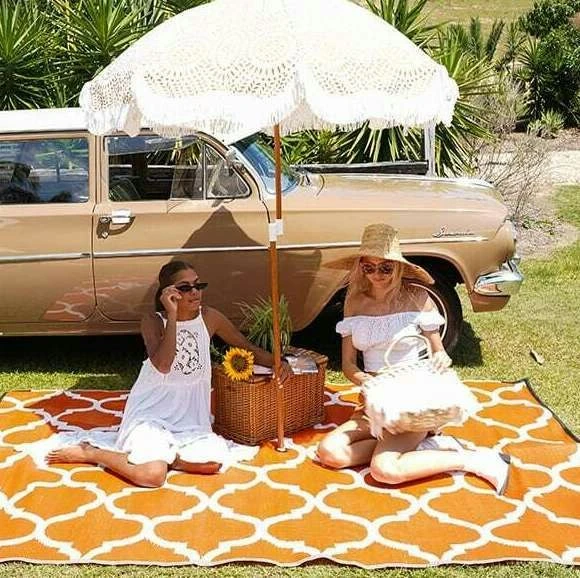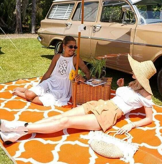 Our team members adore this mat in Orange and White – one of them says it reminds her of a setting sun. In any case, it sure is bright and vibrant, and a real talking piece when you are out and about.