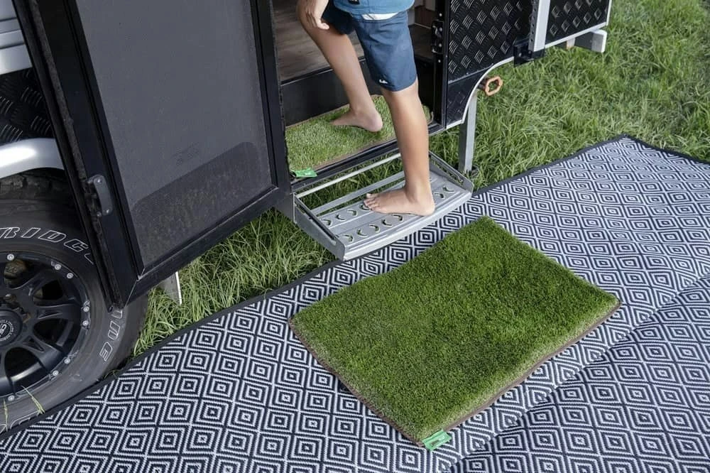 They are ideal to be used when camping to clean your feet before getting into your caravan or tent. The 40mm blade grass makes them soft underfoot and easy to transport or move around.