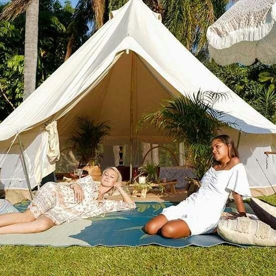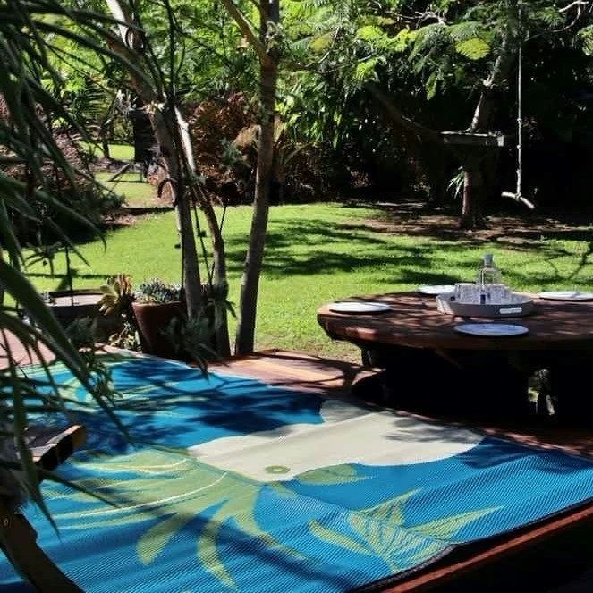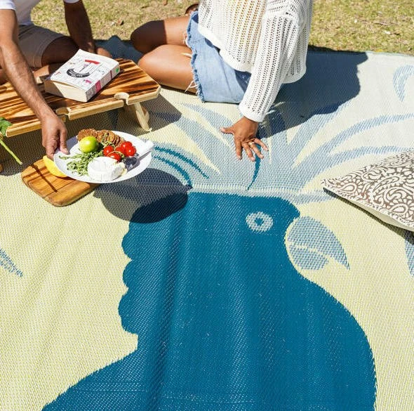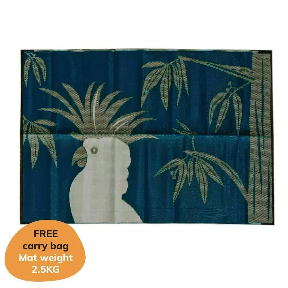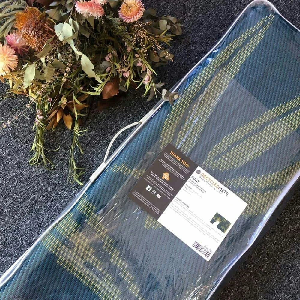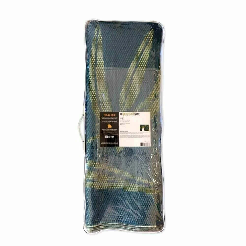 The striking gold, white and teal 1.8 x 2.7m mat is made from repurposed polypropylene to help protect Mother Earth and comes with a complimentary recycled plastic carry bag.