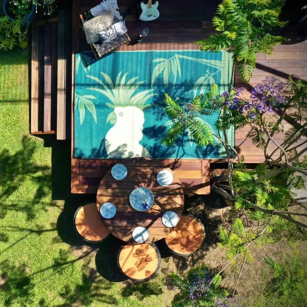 One of Australia’s most popular and iconic birds, the sulphur-crested Cockatoo, is featured on the Polly mat in the branches of a Eucalyptus Gum Tree.