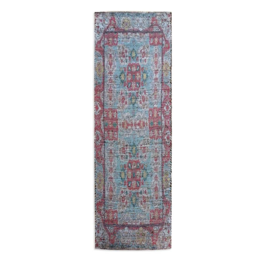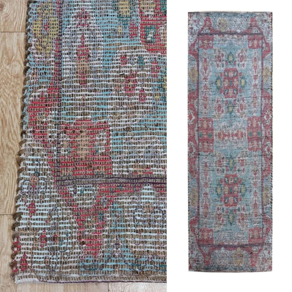 This distressed-look finish in faded blues and natural tones has a gorgeous flat-weave pile made from a blend of polyester chenille and jute. Expertly woven with intricate, printed patterning and elaborate motifs, this lovely runner features an aged vintage look though is incredibly sturdy and well suited to high traffic zones.