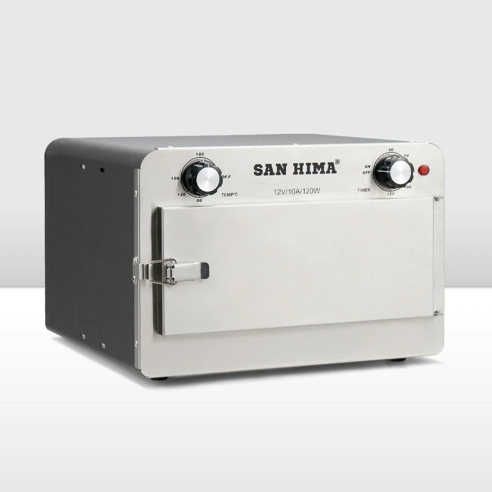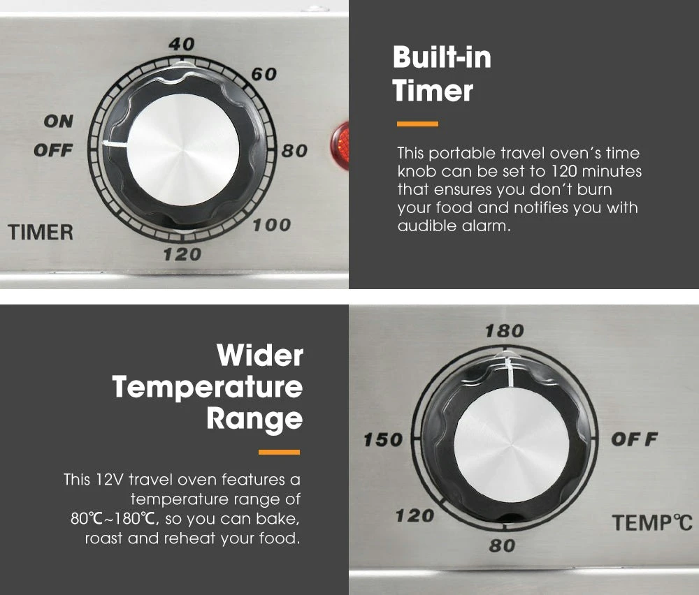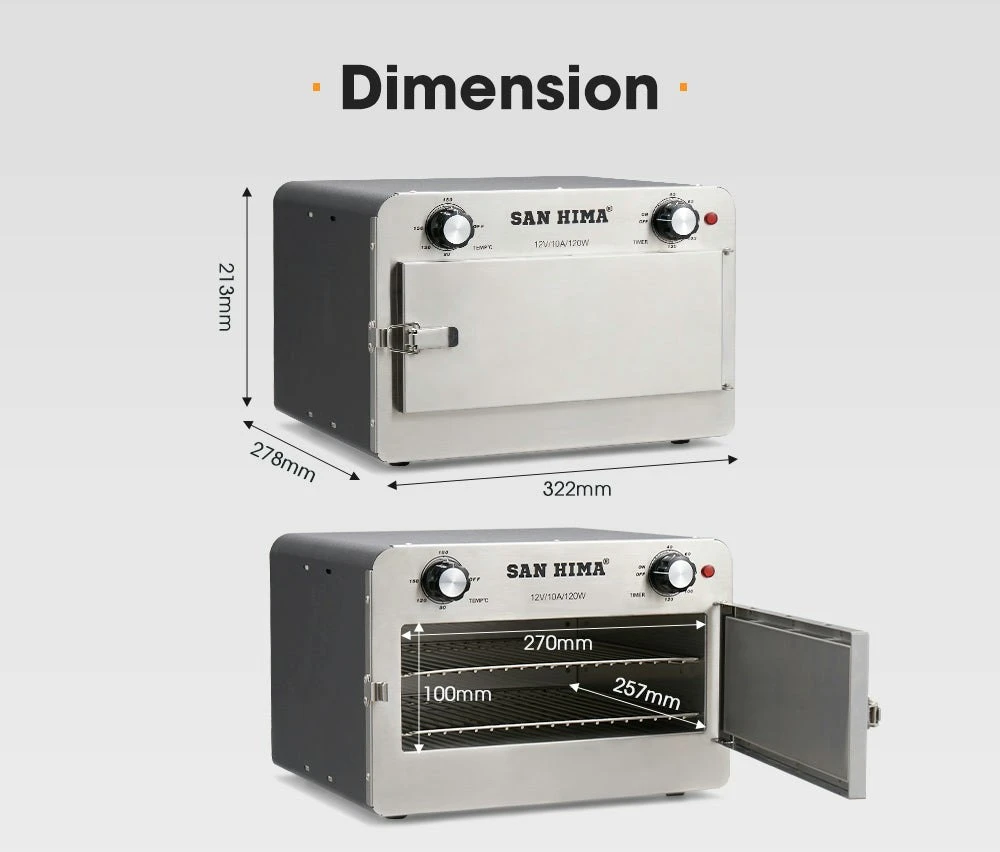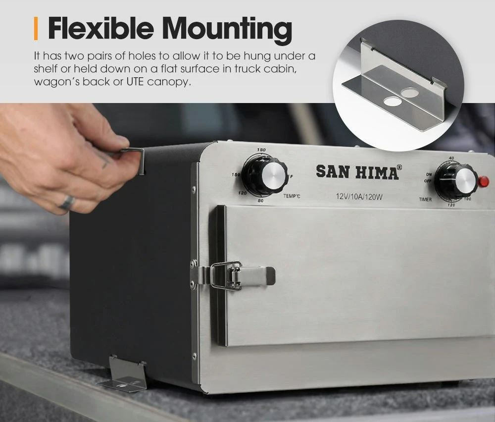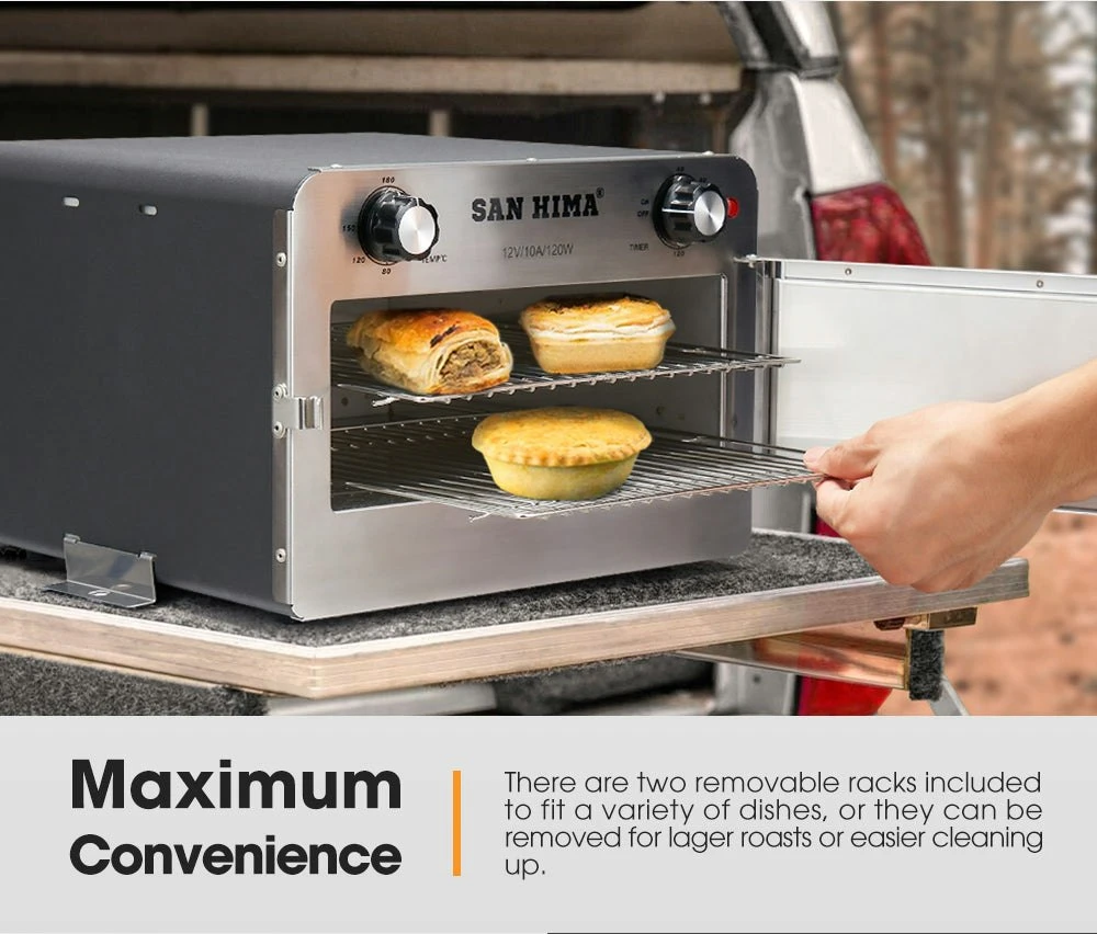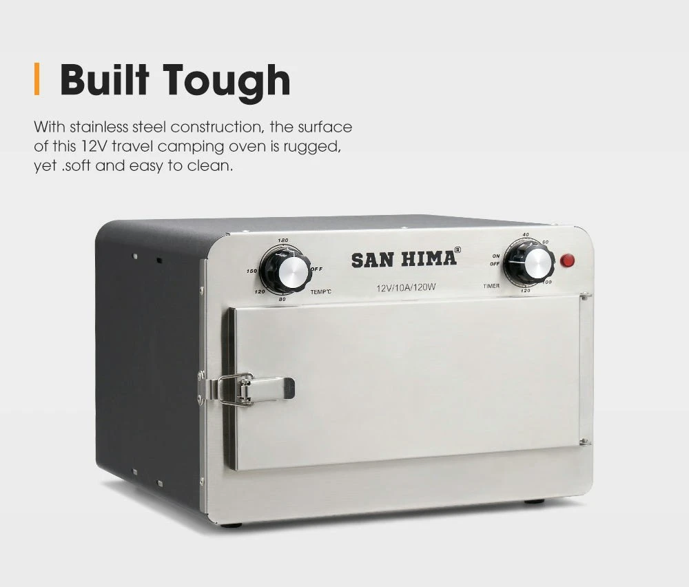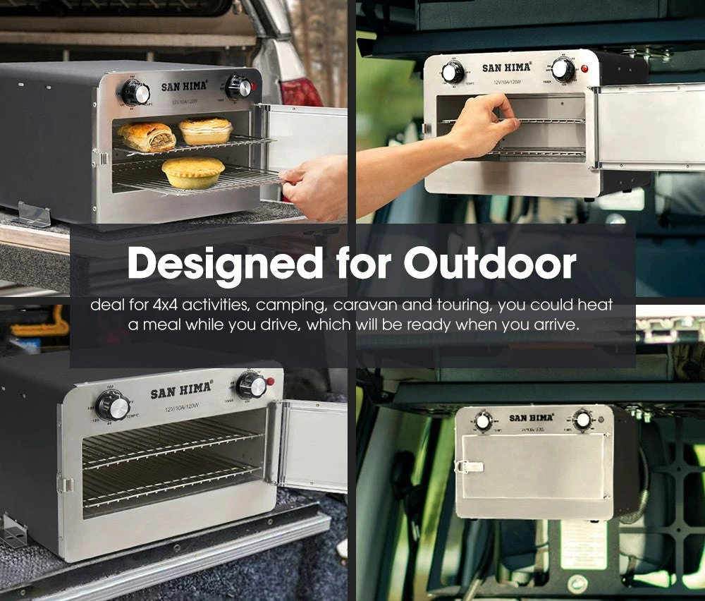 DESCRIPTION Eating canned food during camping is a thing in the past. Now you can double the fun with fresh toast or cake with the help of the San Hima 12V travel camping oven/portable travel oven. This 12V oven features a max temperature of 180℃, eating fresh grilled chicken while enjoying the wilderness is no longer a dream!Ideal for 4×4 activities, camping, caravan and touring, this 12V travel camping oven allows you to use any 12V setup to reheat, bake or roast your food while you’re driving. Just load your pies or pasties in this 12V travel oven, plug into your cig socket then set the timer, and it’ll be ready when you arrive. Made of Stainless Steel, this 12V travel oven is designed to withstand harsh use. This 12V travel oven is encased in insulation and the door has a second skin with minimal heat transfer. A solid door clasp ensures your food stay within the oven, and two pairs of holes allow it to be hung under a shelf or held down on a flat surface. FEATURES Designed for Outdoor: Ideal for 4×4 activities, camping, caravan and touring, you could heat a meal while you drive, which will be ready when you arrive. Plug & Play: There are two 12V connection options by this 12V oven – a fused Anderson style plug and Anderson cigarette lighter plug- for any 12V setups. Fully Insulated Housing: Each San Hima 12V travel camping oven is encased in insulation and the door has a second skin internally for efficient heat retention. Built TOUGH: With Stainless Steel construction, the surface of this 12V travel camping oven is rugged, yet soft and easy to clean. Higher Safety: This 12V travel oven has a solid door clasp to hold the door closed and ensure your food stay within the oven despite bumping and sudden brakes. Maximum Convenience: There are two removable racks included to fit a variety of dishes, or they can be removed for lager roasts or easier cleaning up. Built-in Timer: This portable travel oven’s time knob can be set to 120 minutes that ensures you don’t burn your food and notifies you with audible alarm. Wider Temperature Range: This 12V travel oven features a temperature range of 80℃~180℃, so you can bake, roast and reheat your food while driving. Flexible Mounting: It has two pairs of holes to allow it to be hung under a shelf or held down on a flat surface in truck cabin, wagon’s back or UTE canopy. Low Maintenance: This portable travel oven/12V travel oven is simple in design, with very little removable accessories to maintain and clean. SPECIFICATIONS
