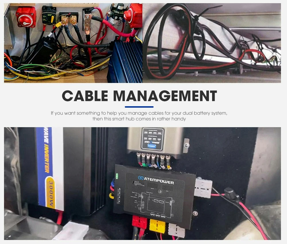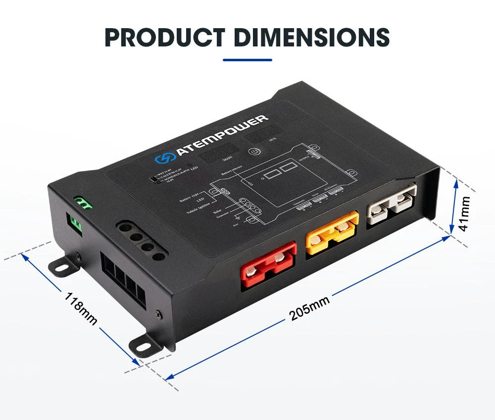 If you enjoy the convenience of dual voltage meters and are trying to simplify cable management for your dual battery system, this sturdy and durable smart hub will be a great pick for you and allow you to optimize the charging process for your auxiliary battery using your DC-DC charger. FEATURES Dual Voltage Meters: This smart hub comes with dual voltage meters to view the real-time voltage status of the main battery and the auxiliary battery. Cable Management: If you want something to help you manage cables for your dual battery system, then this smart hub comes in rather handy. Universal Fitment: This smart hub fits most DC-DC chargers, including ATEM POWER, CTEK, RENOGY, REDARC and Projecta. Multi Battery Selection: This dual battery system smart hub by ATEM POWER is compatible with wet, calcium, AGM, Gel and LiFePo4 batteries. Easy Installation: This compact and portable DC to DC smart hub can be easily installed anywhere in the vehicle and is easy to remove when changing vehicle. Easy Connection: This dual battery system smart hub by ATEM POWER features color coded Anderson plugs for easy differentiation and connection. Durable Construction: Sturdy steel housing is built to resist harsh Australian conditions and quality connectors are built for long last durability. User Friendly Design: This smart hub features an LED light that is designed to show the real-time status of power. Explicit Instructions: An explicit user manual is included for dual battery system wiring diagrams with different kinds of DC-DC chargers. NOTE: Please be aware that this is NOT a charger but a hub. SPECIFICATIONS
