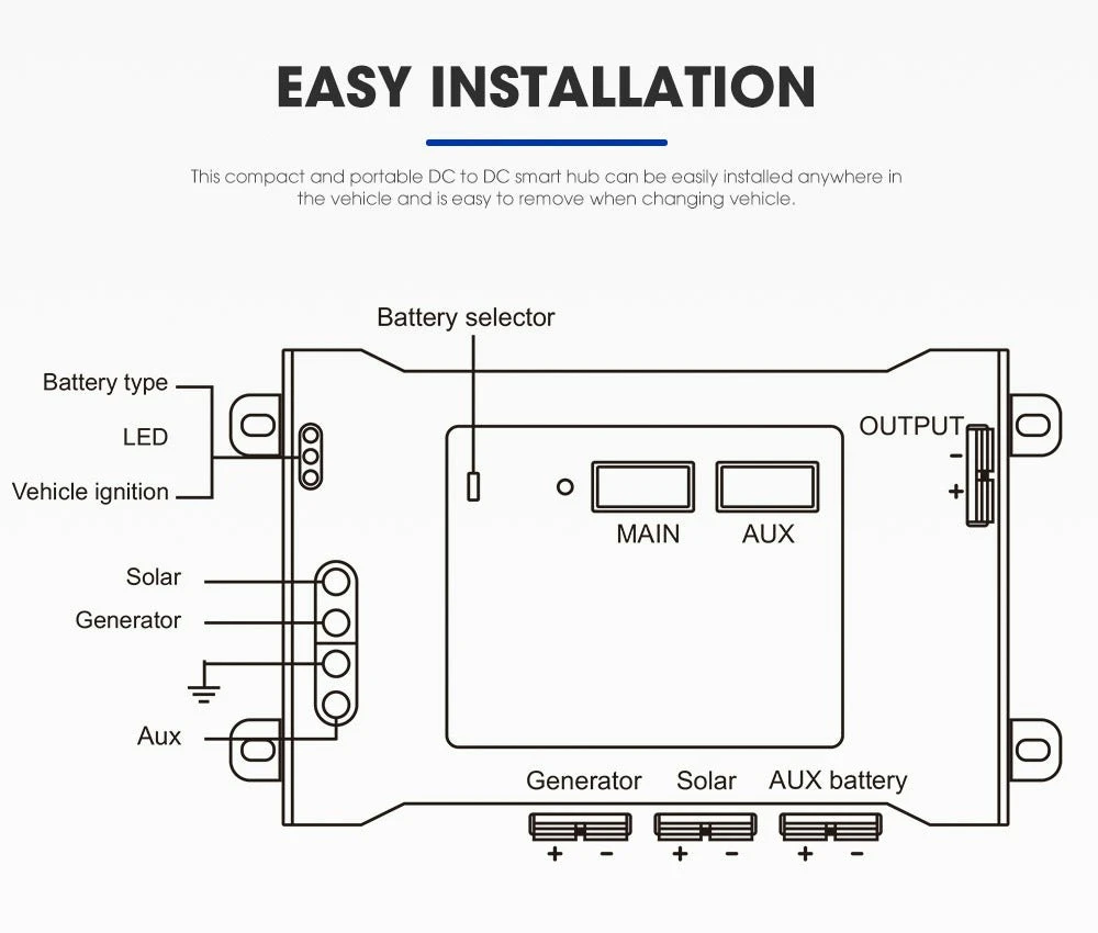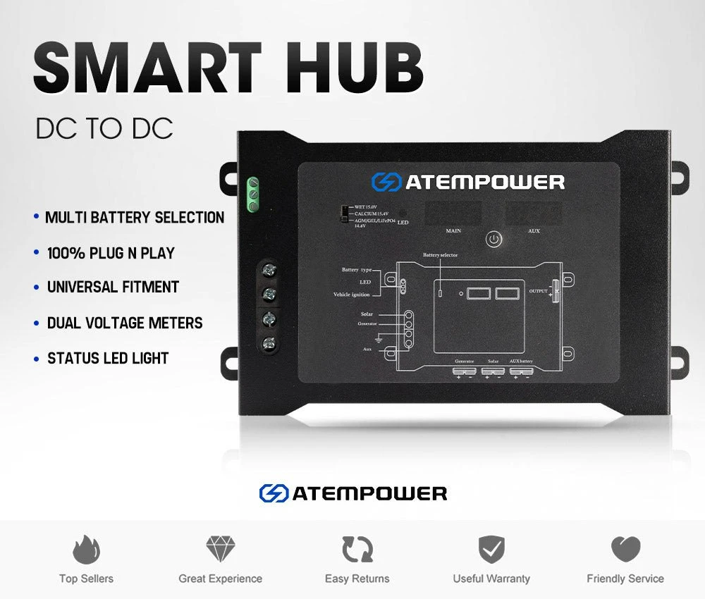 DESCRIPTION A DC-DC charger is a smart way to ensure your auxiliary battery reaches its maximum charge capacity in a safe, fast and regulated way. What can also be integral to your dual battery setup is a DC to DC smart hub, which comes with dual voltage meters to view the real-time voltage status of the main battery & the auxiliary battery for your convenience. Fitting most DC-DC chargers, this smart hub by ATEM POWER features marks for all terminals & connectors on the top panel and color coded Anderson plugs for easy connection. As an added bonus, this compact and portable smart hub will be hassle free with the explicit user manual for dual battery system wiring diagrams with different kinds of DC-DC chargers.