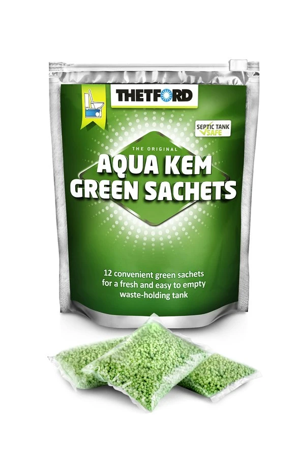 Convenient green water soluble sachets for the waste-holding tank, safe to empty in the Septic Tank.