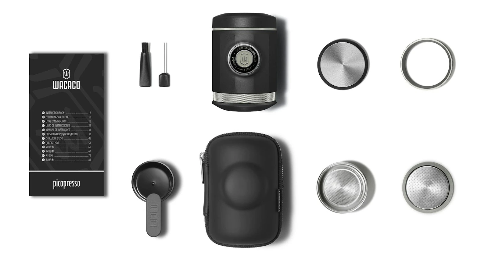 Package includes: Picopresso, double filter basket, tamper, scoop, brush, distribution tool, funnel, protective case, multi-languages instruction book, warranty card, and a Wacaco sticker.